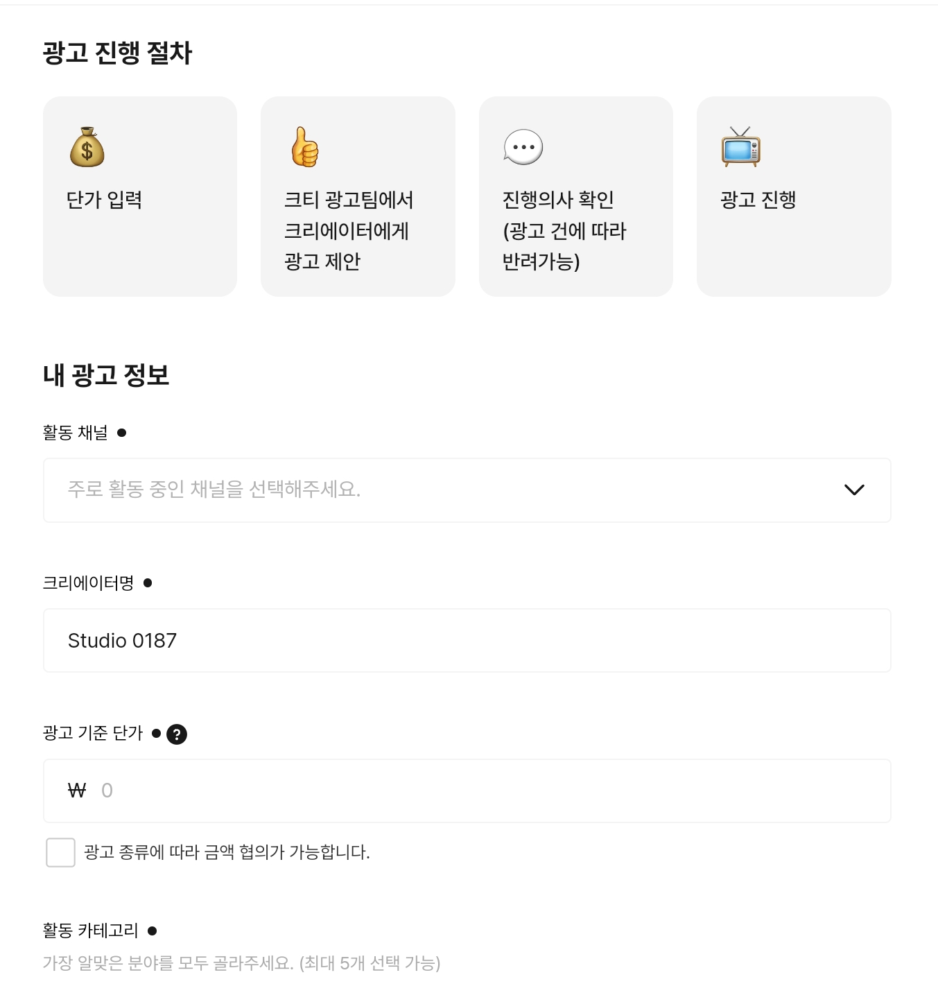 마지막으로 광고 진행 기능도 있는데, 크리에이터와 광고할 업체를 연결해주는 기능인것 같다. 딱히 무슨 기능인지 설명이 전혀 없어서 좀 아쉽다.