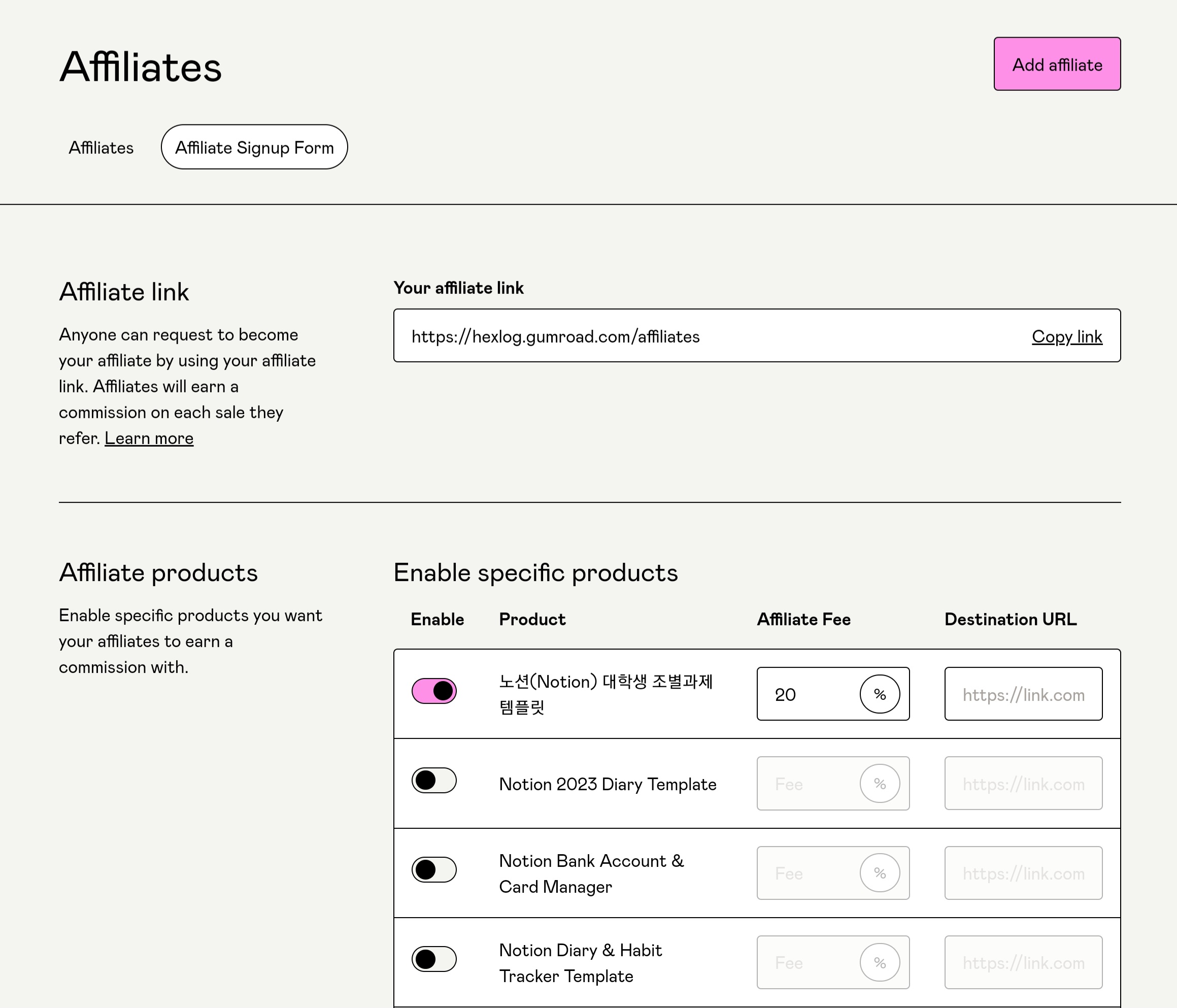 상단 Add affiliate 버튼을 눌러 상대방의 노션 계정을 입력하여 어필리에이트를 추가할 수도 있고(=제 어필리에이트가 되어주세요!), 어필리에이트 링크를 뿌려서 모르는 사람으로부터 어필리에이트 신청을 받을수도 있다(=제 어필리에이트 하실분?).