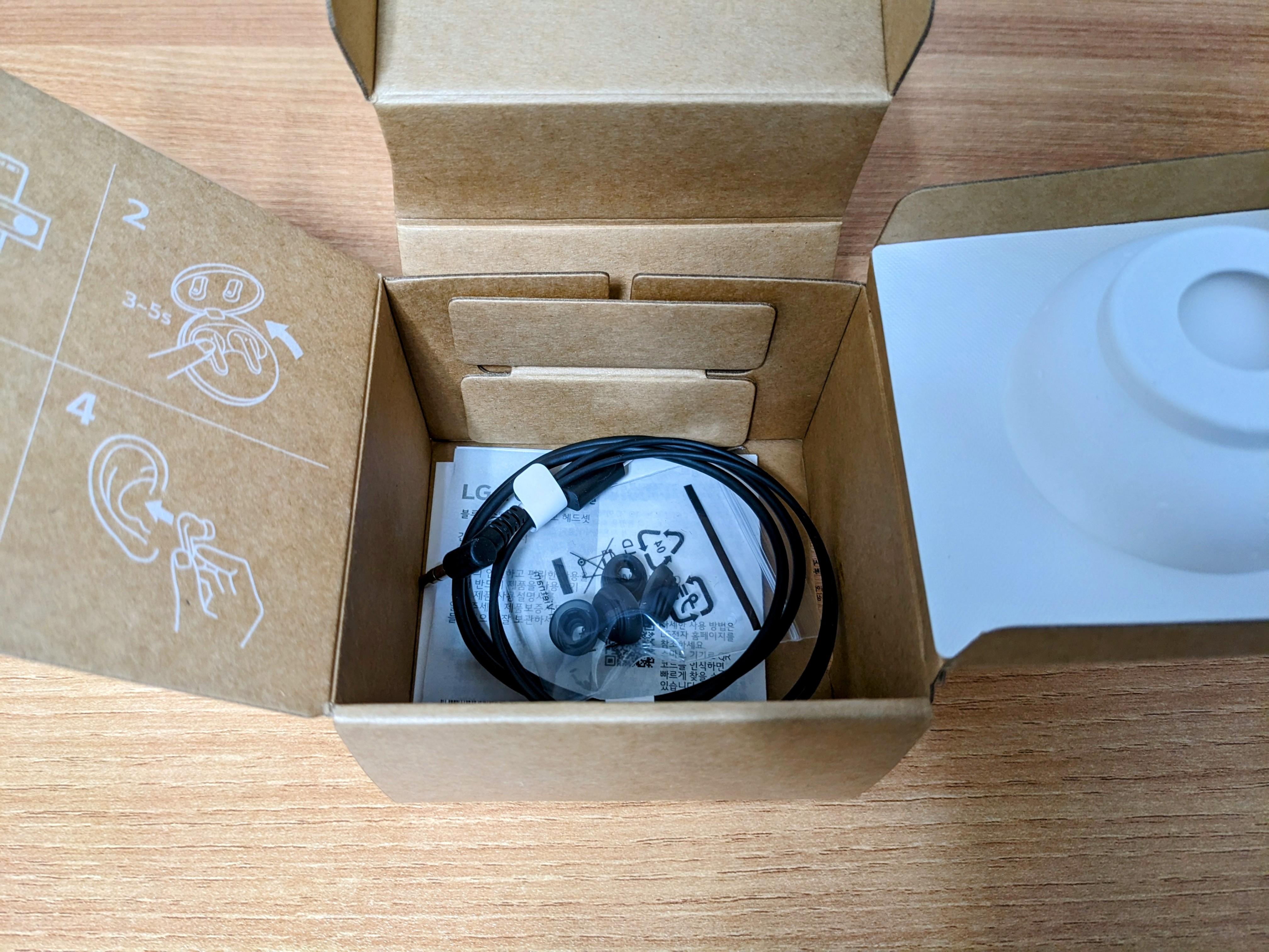 사진에는 담지 못했지만 처음 열었을때 은은한 파란색 LED 무드라이팅이 들어온다. UV 나노 기능이 탑재되있다는걸 시각적으로 보여주는건데, 실제 효과는 뭐 lg 공홈에 다 설명되있으니 여기서 설명은 패스하고, 일단 귀에 끼웠을때 이어팁이 따끈따끈한게 느껴져서 심리적 효과는 확실하다(?).