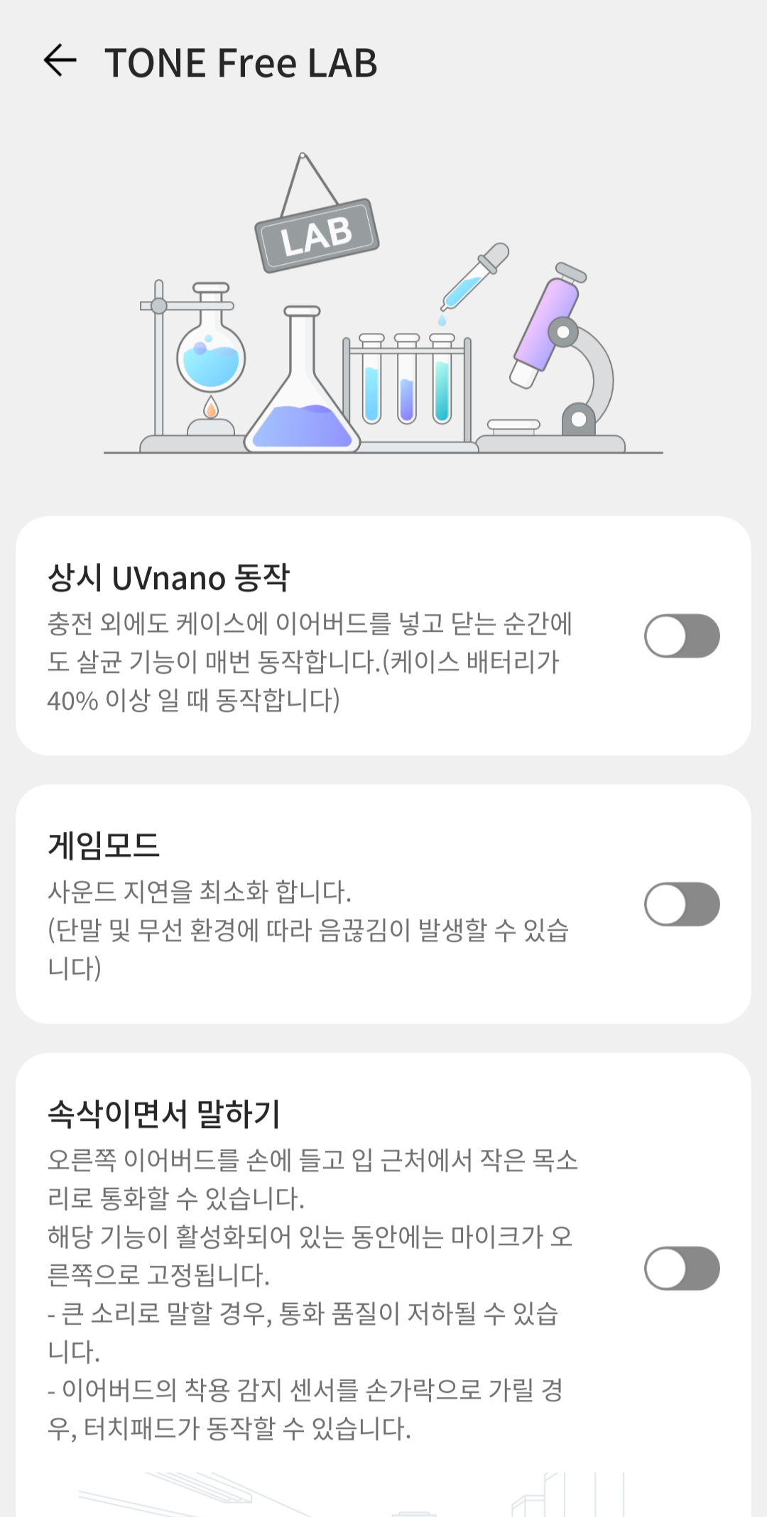 실험중인 기능들을 한데 모아놓은 랩 메뉴에는 상시 UVnano, 게임모드, 속삭이면서 말하기, Plug & Wireless 설정 총 4가지 옵션이 있다 (2023.02.16기준).