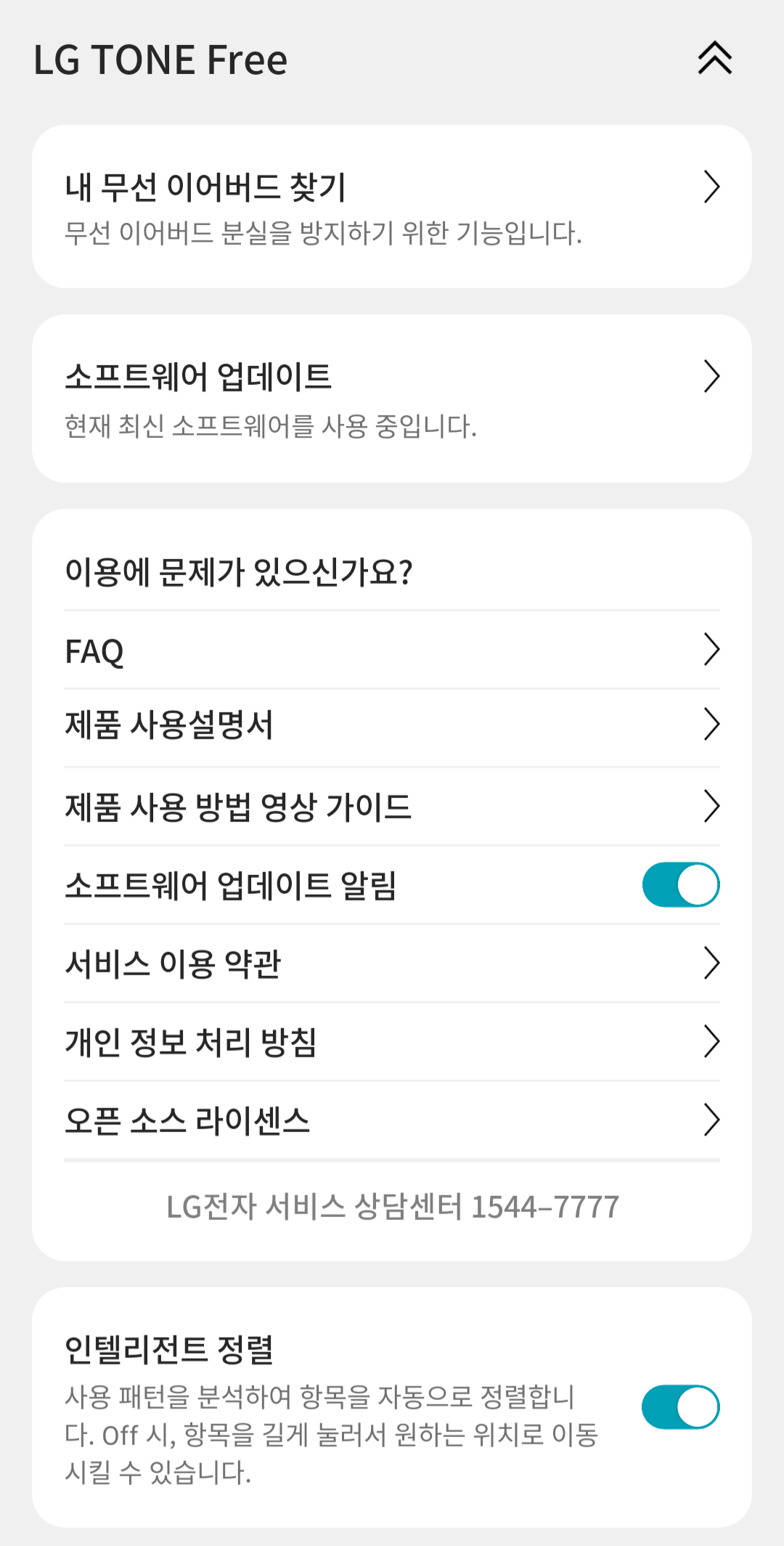 지금은 사라진 LG폰의 감성이 미묘하게 느껴지는 전용 어플의 UI. 따로 내비게이션 탭 바 없이 모든 옵션들이 직관적이게 한 화면에 쭉 나열되있어 기능 찾느라 편리한듯. 또한 "인텔리전트 정렬"이라고 하여 사용 패턴을 분석하여 항목을 자동으로 정렬해주는 기능까지 지원한다. LG ThinQ의 잔재인가