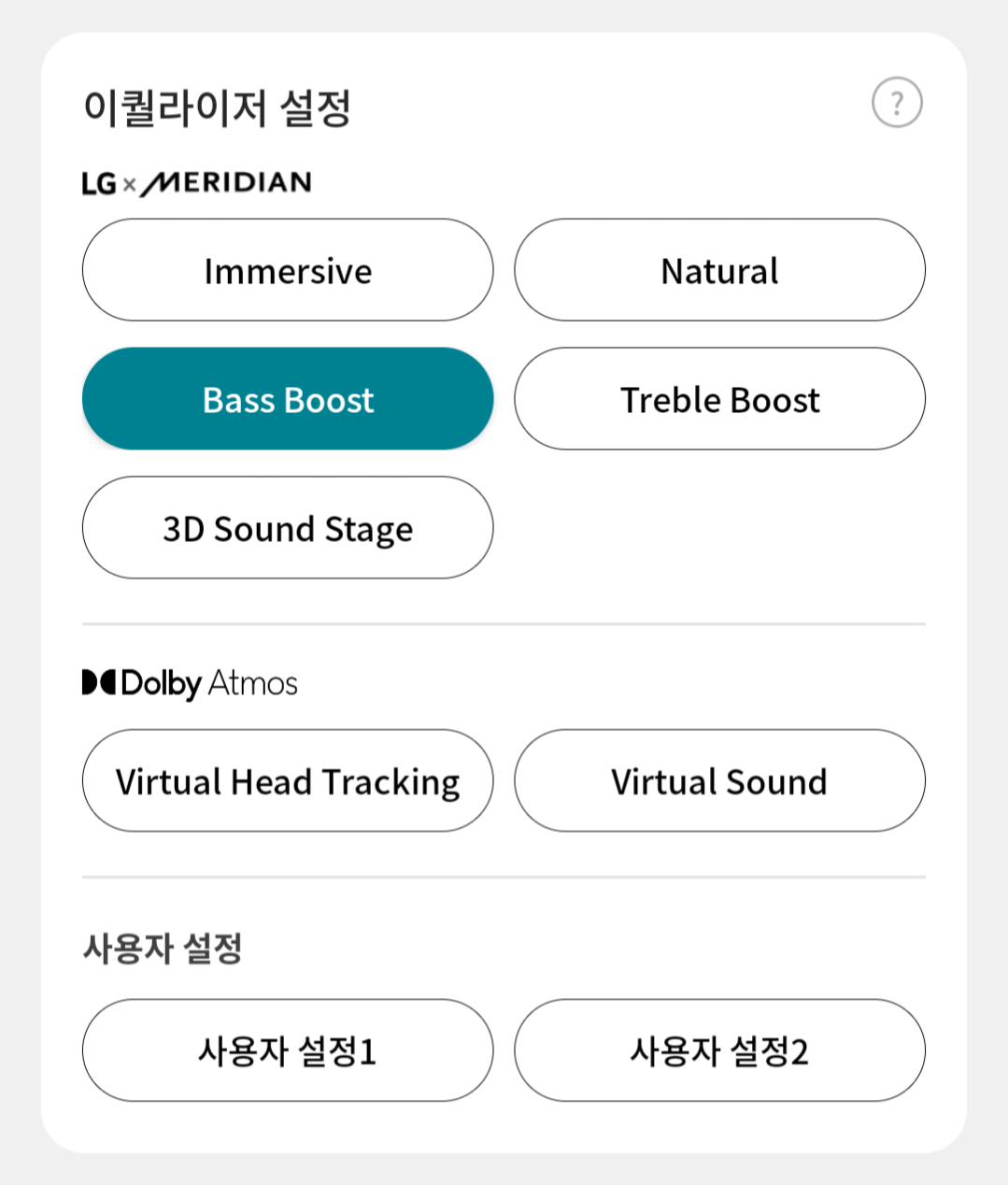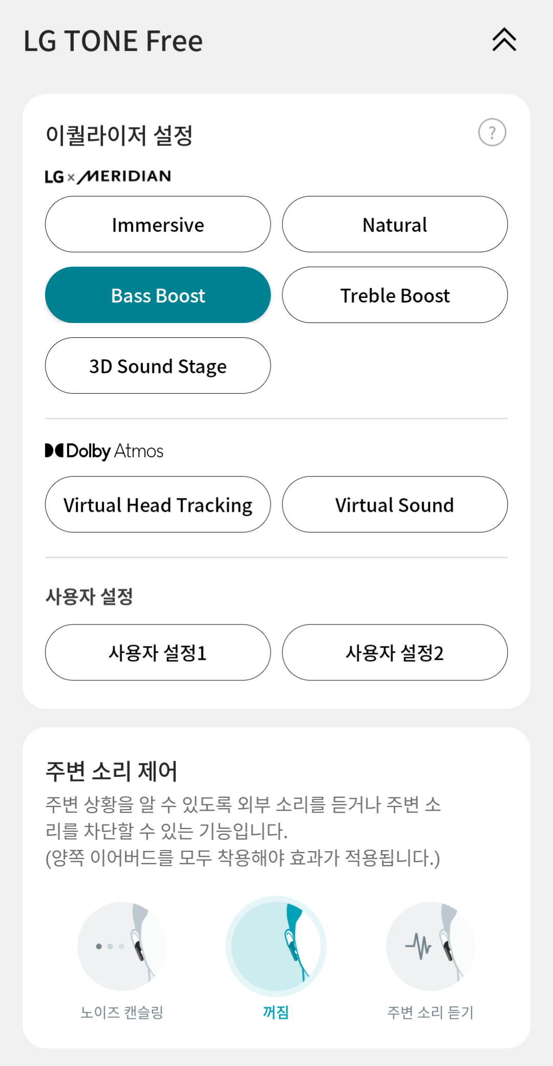 기본적으로 5개의 메리디안 튜닝 이퀄라이저와 2개의 돌비 애트모스 음향효과가 탑재되어있다. 기본 이퀄라이저는 Bass Boost로, 이름에서 볼 수 있듯이 중저음이 강조되는 효과인데, 개인적으로는 Immersive가 좀 더 균형이 잡힌 느낌이라 취향에 맞았다.