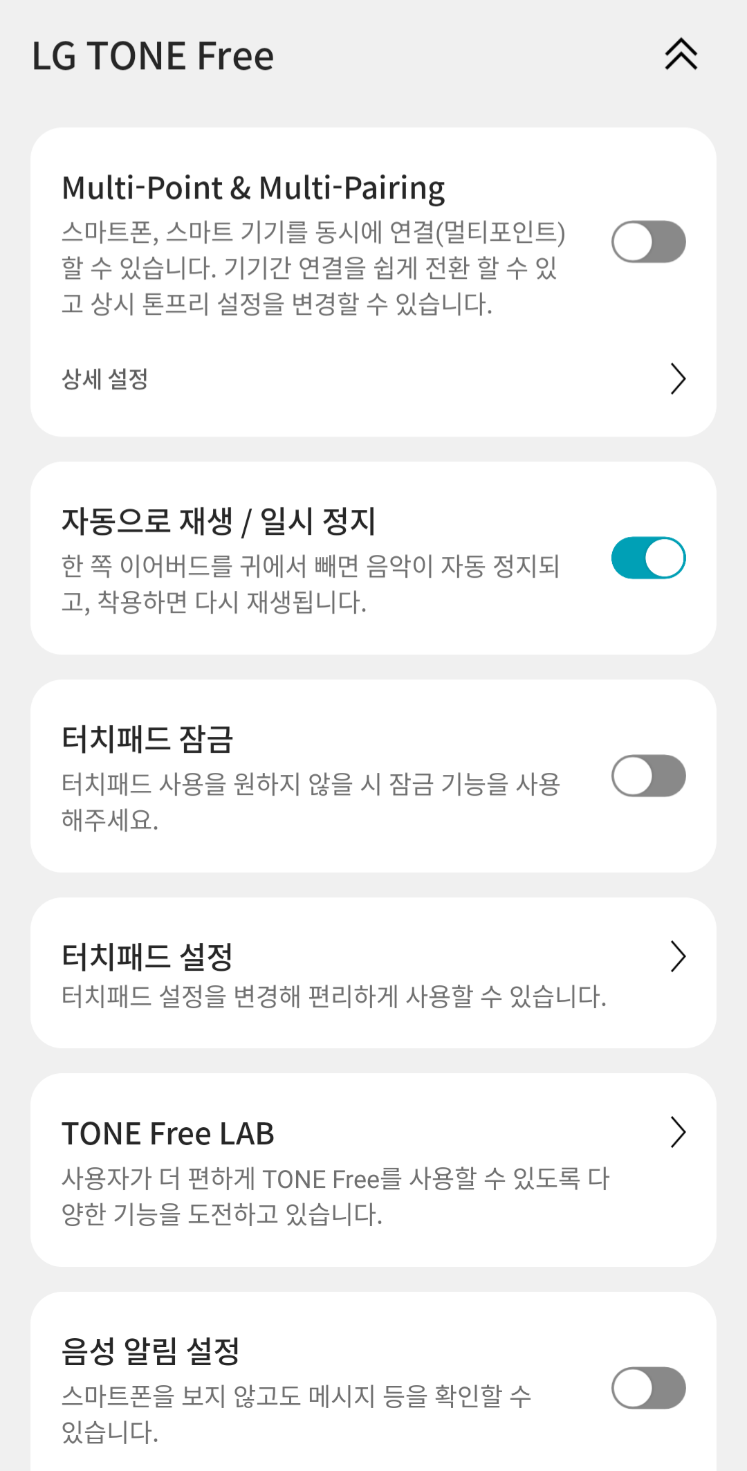 일부 무선 이어폰은 터치패드를 터치했을때 아무런 피드백이 없어 내가 제대로 터치한게 맞는지 헷갈려서 결국에는 터치패드 기능 자체를 잘 안쓰게 되던데, 톤프리의 터치패드는 확실히 터치했다는걸 알려주는 터치음이 있어서 개인적으로 매우 편리했다. (LG폰 화면 터치음과 똑같아서 추억돋는건 덤.)