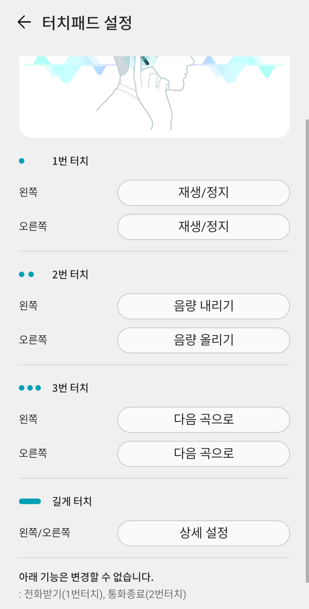 짧게 터치는 재생/정지, 음성명령 (구글 어시스턴트 등), 이전곡/다음곡, 음량 올리기/내리기를 지원하고, 길게 터치는 노이즈 캔슬링/주변소리 듣기/끄기 간 전환만 지원한다. 길게 터치는 왼쪽/오른쪽 따로 설정이 불가능하고, 주변소리 제어 모드 간 전환만 가능하고 다른 기능은 설정할 수 없는게 좀 아쉽다.