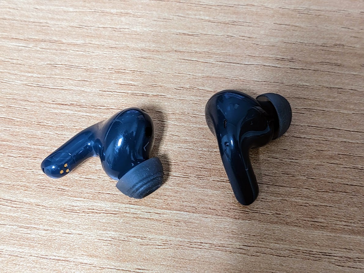 이어폰 본체의 모습. 유광 재질에 완전 블랙보다는 매우 진해서 검정에 가까운 네이비 색상이라고 할 수 있다. 착용감지 센서가 달려있어 이어버드를 빼면 자동으로 일시정지하는 기능도 지원한다.