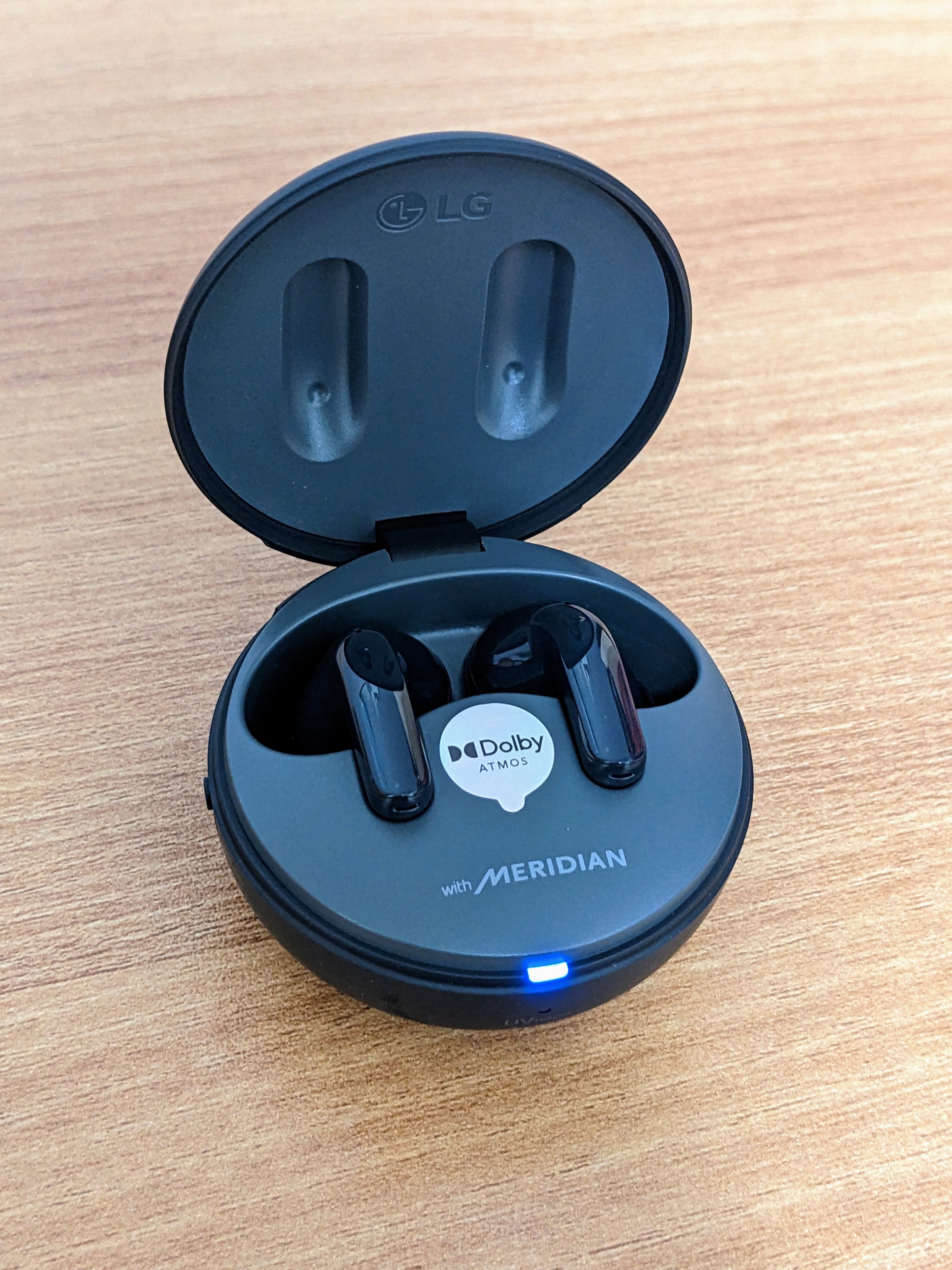 전자제품은 흰색보단 검은색을 선호해서 차콜 블랙으로 구매했다. 충전 케이스 겉면에는 살짝 맨들맨들한 무광 재질 위에 톤프리 로고가 프린팅되있고 (LG로고가 아니라 천만다행), 열어보면 이어폰 본체와 돌비 애트모스 스피커, 그리고 메리디안 로고 프린팅이 보인다. 메리디안 로고가 너무 튀어서 불호라는 의견도 있던데 내 눈에는 못봐줄 수준은 아니었다.