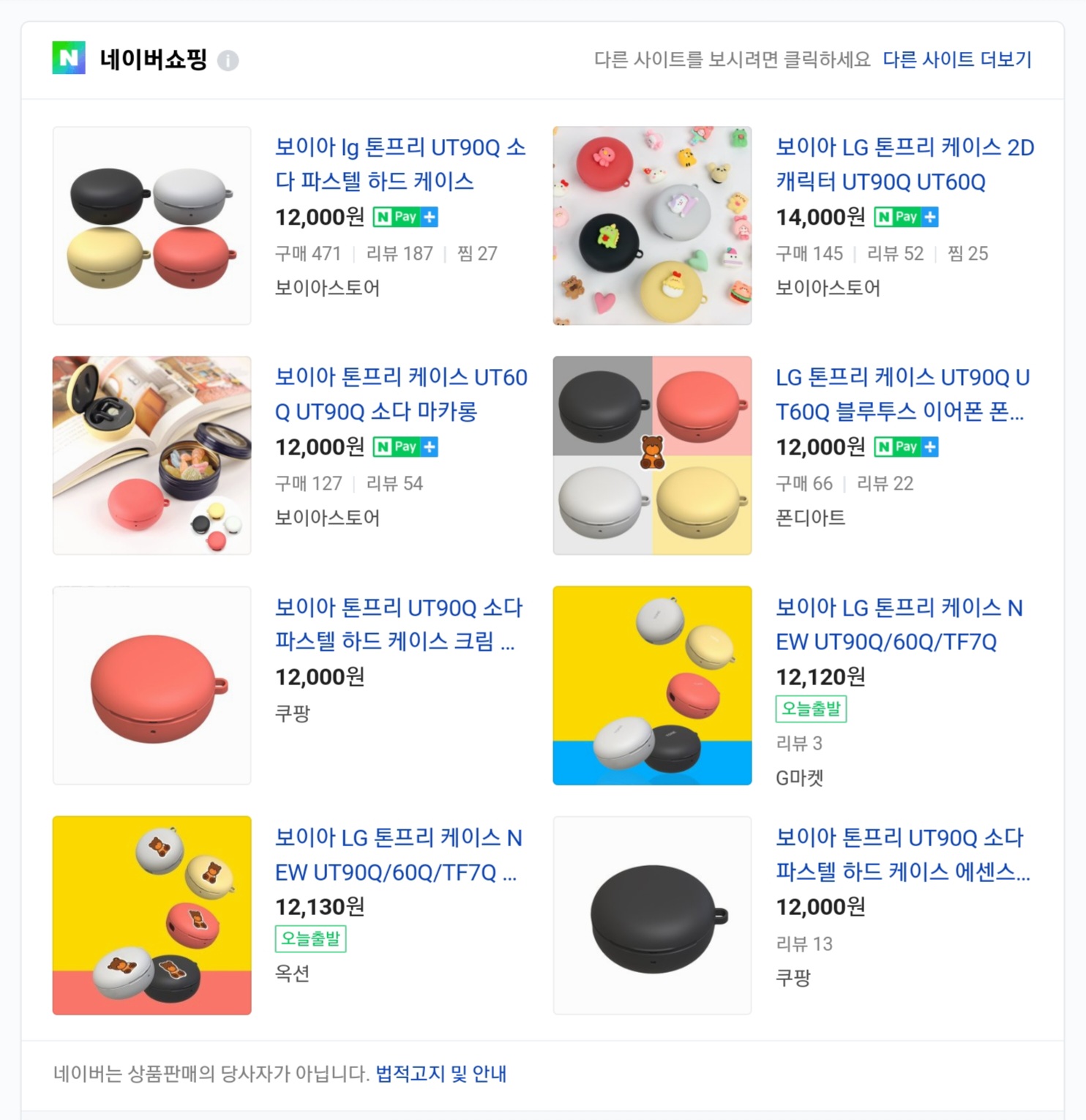 에어팟이랑 버즈는 별의별 디자인의 케이스가 차고 넘쳐나는 반면, 톤프리는 케이스가 그냥 없다고 봐도 무방한 수준이다. 구형 모델은 그나마 케이스 종류가 다양한 편인데, UT60Q와 UT90Q 두 최신형 모델은 출시한지 시간이 꽤 지났음에도 불구하고... 없다.