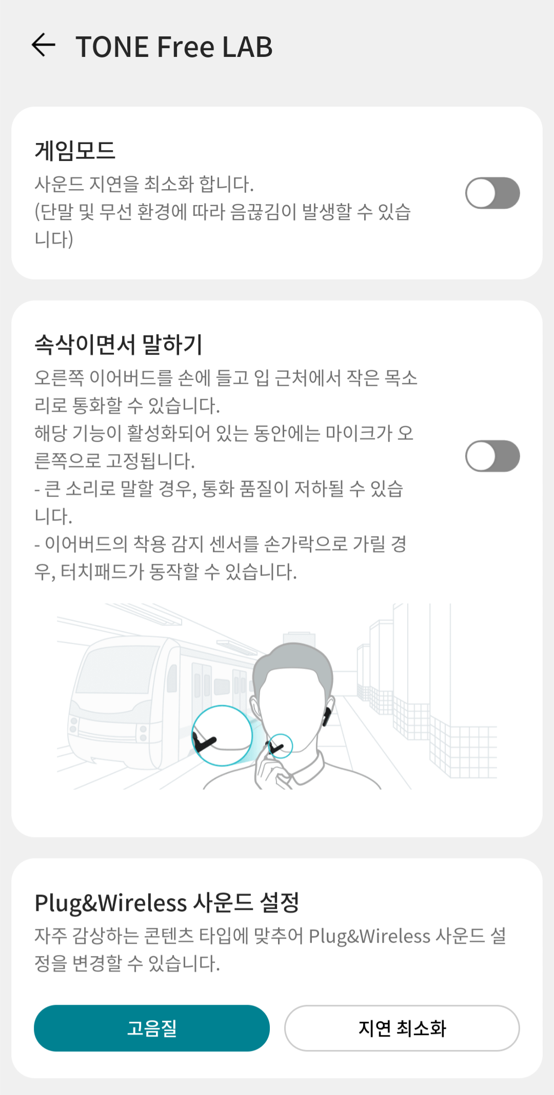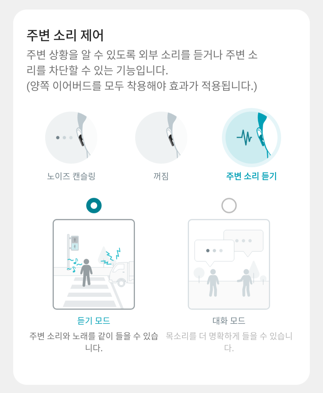 주변 소리 듣기는 소리를 잘 들리게 해주는 듣기 모드와 목소리를 더 잘 들리게 해주는 대화 모드 두가지가 있다. 인위적으로 주변에서 들리는 모든 소리를 증폭시켜주다보니 다소 부자연스러운데, 그냥 밖에서 걸어다닐때랑 대화할때는 이어폰을 끼지 않는걸로.