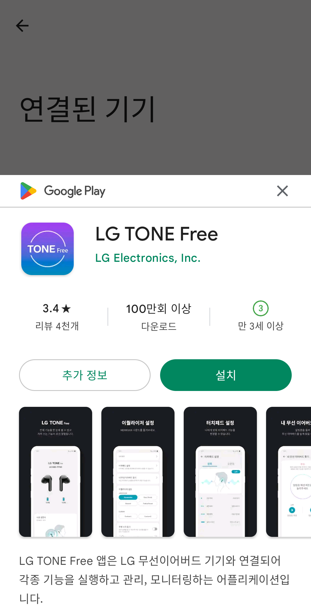 구글 인증을 받은 제품답게, 아이폰에 에어팟 연결할때처럼 케이스 뚜껑을 열면 휴대폰에 바로 연결 안내 팝업창이 뜬다. 팝업창이 떴을때 연결하는걸 놓쳤더라도 블루투스 설정에 들어가면 맨 상단에 빠른 페어링 옵션과 전용 어플 다운로드 링크가 떠있을거다.