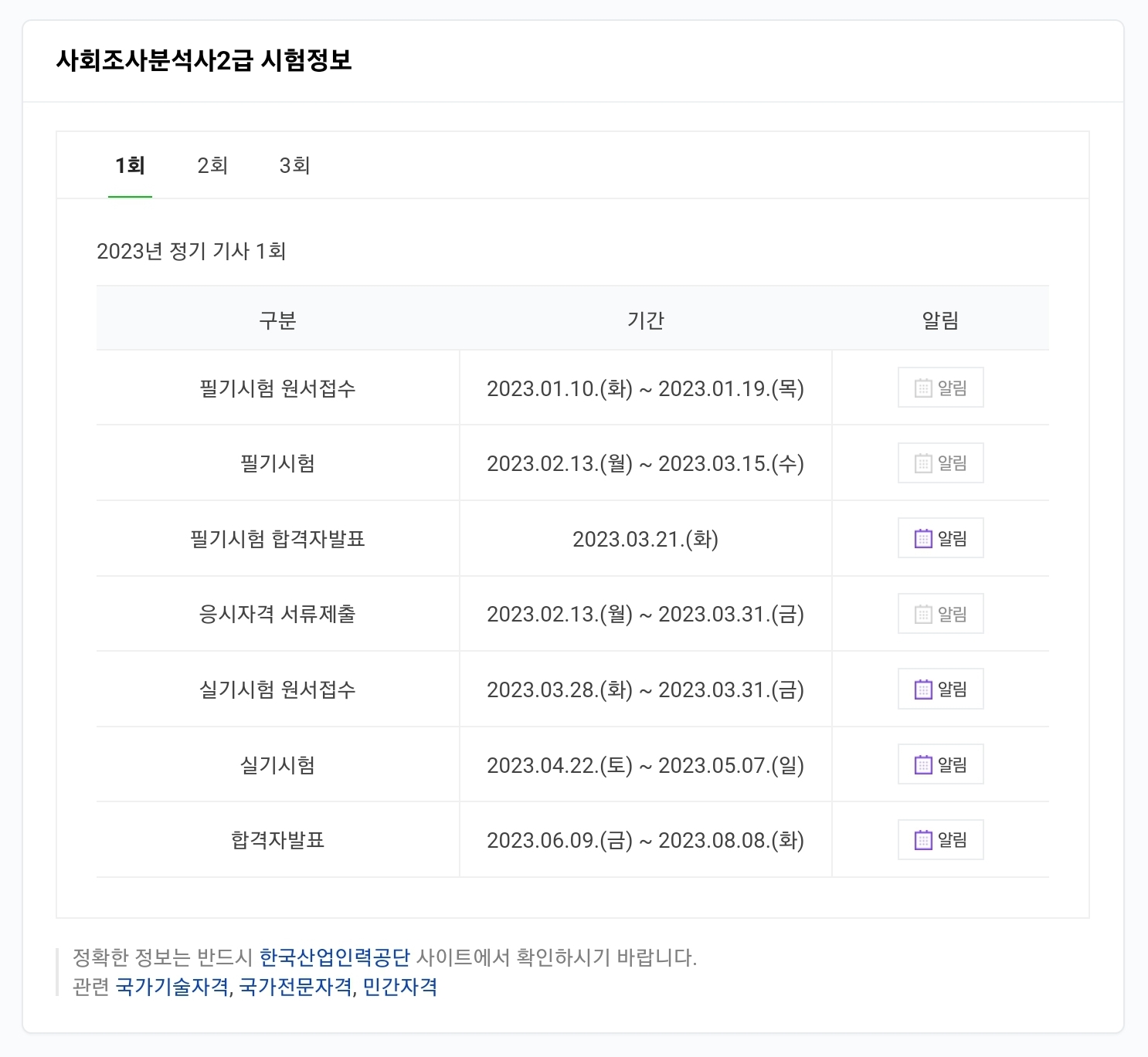 사회조사분석사를 비롯한 정기 기사/산업기사 등 자격증 시험은 컴퓨터활용능력처럼 거의 매일 시험이 열리는 상시시험이 아닌 1년에 많아봤자 딱 4번 치르는 정기시험이다. 한정적인 시험 일