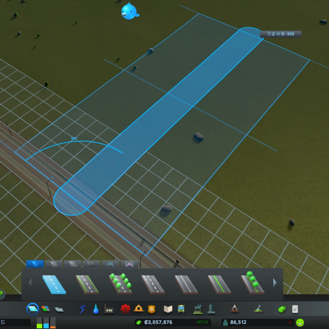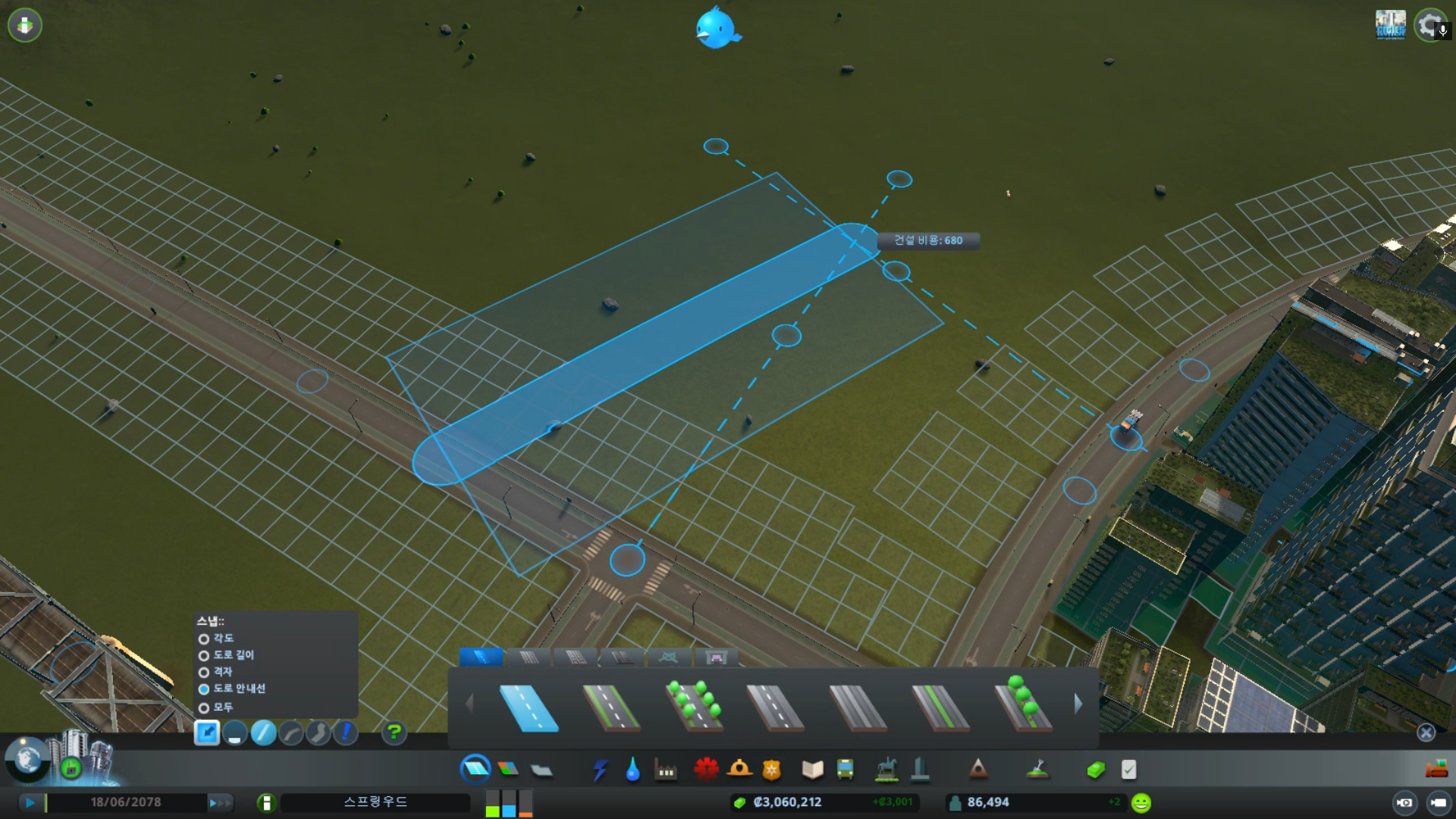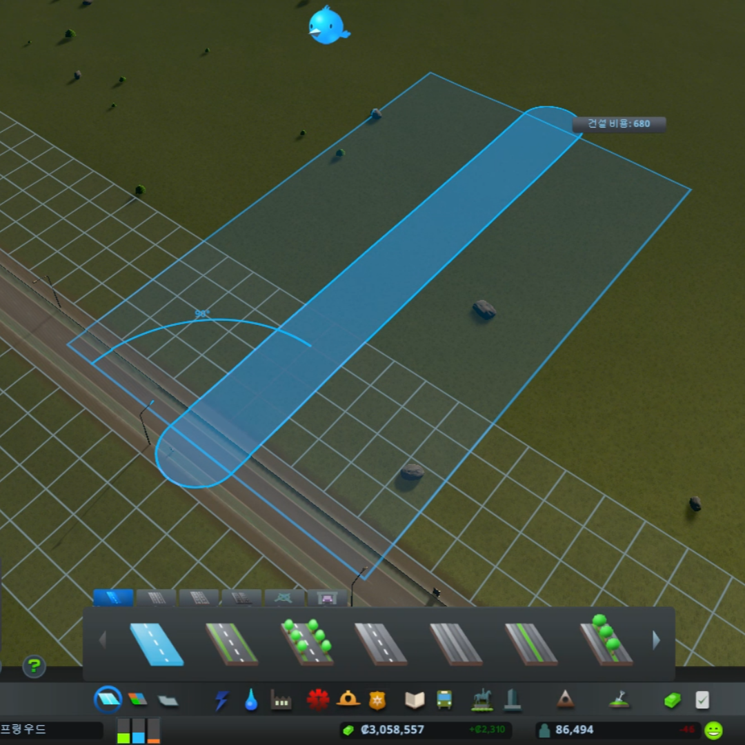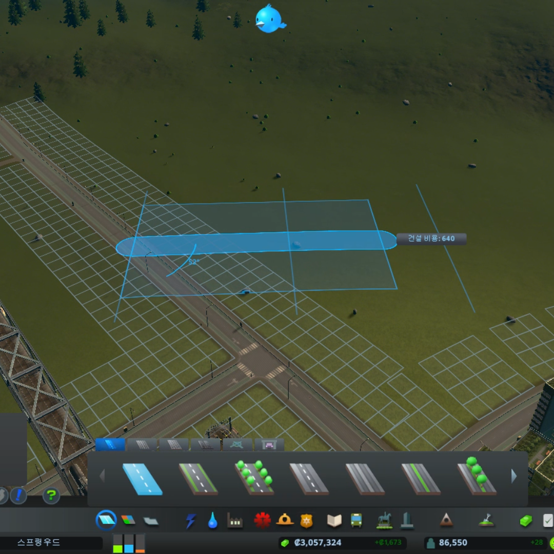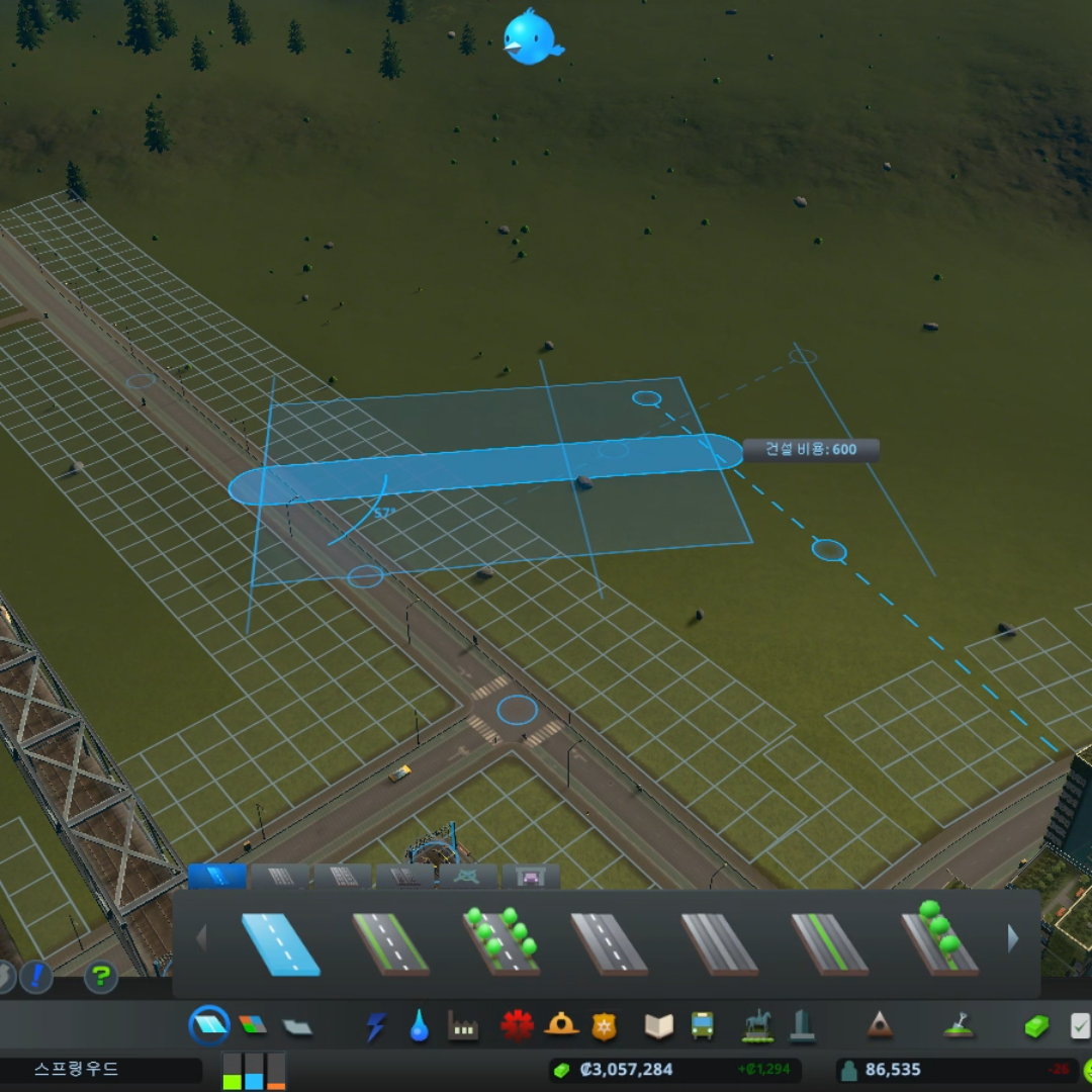 만약 "격자" 옵션이 켜져있다면 위 사진처럼 도로가 자동으로 격자에 딱딱 맞춰서 지어지지만, 끈다면 격자와 상관 없이 자유롭게 이동이 가능하다.