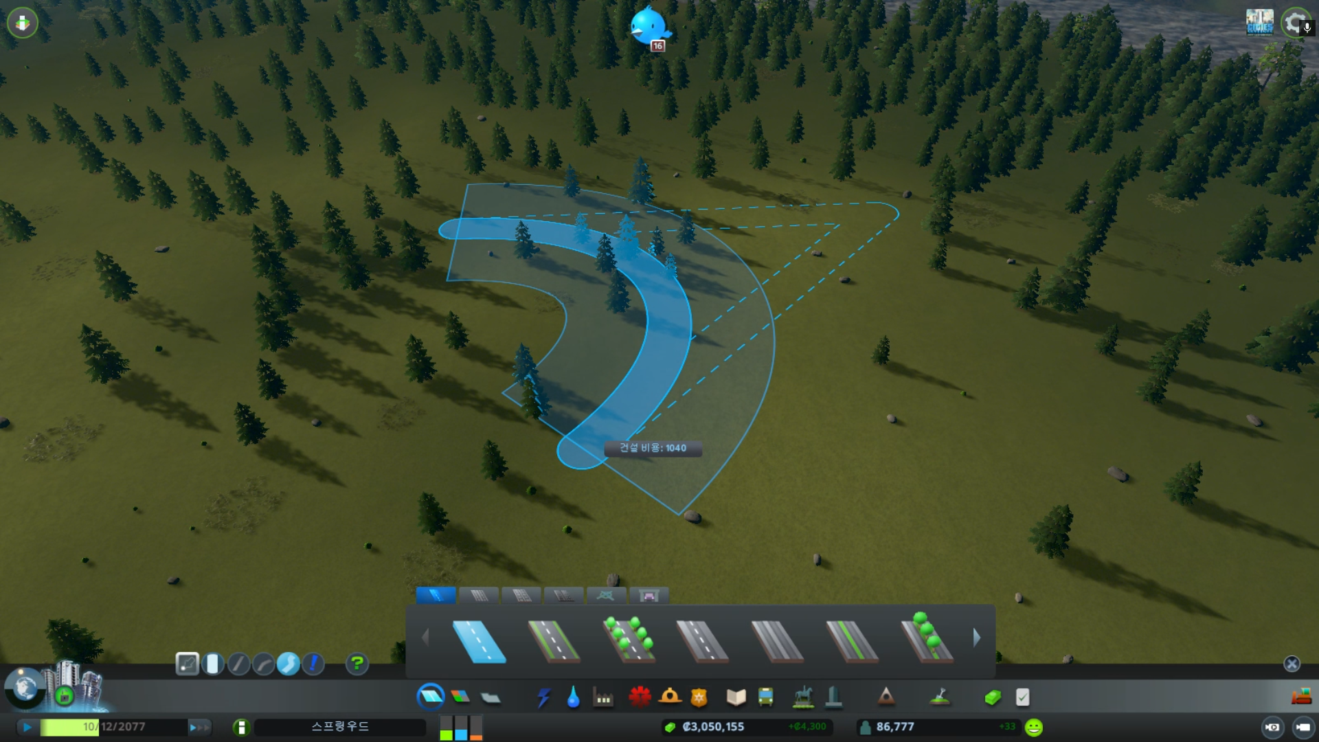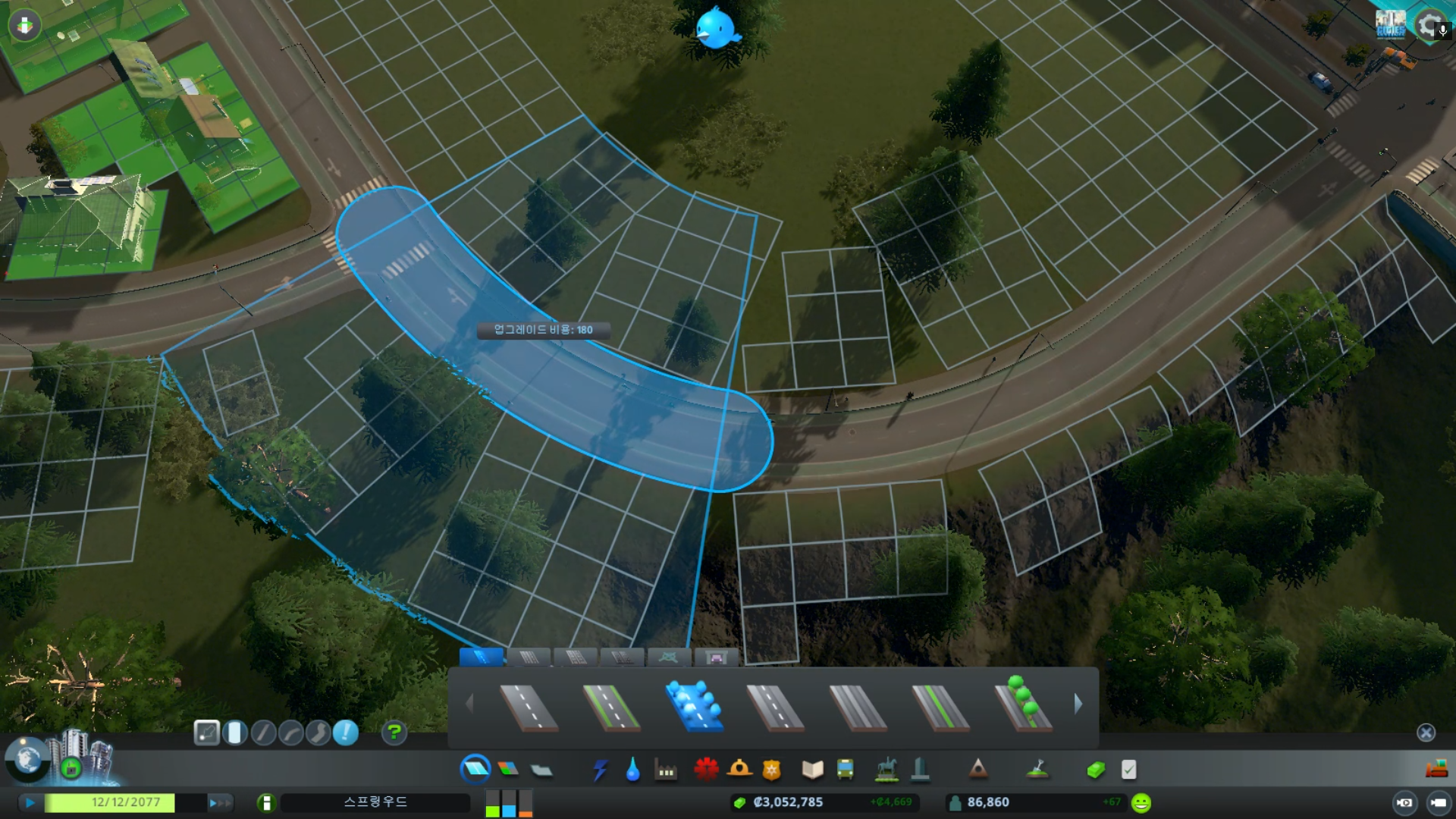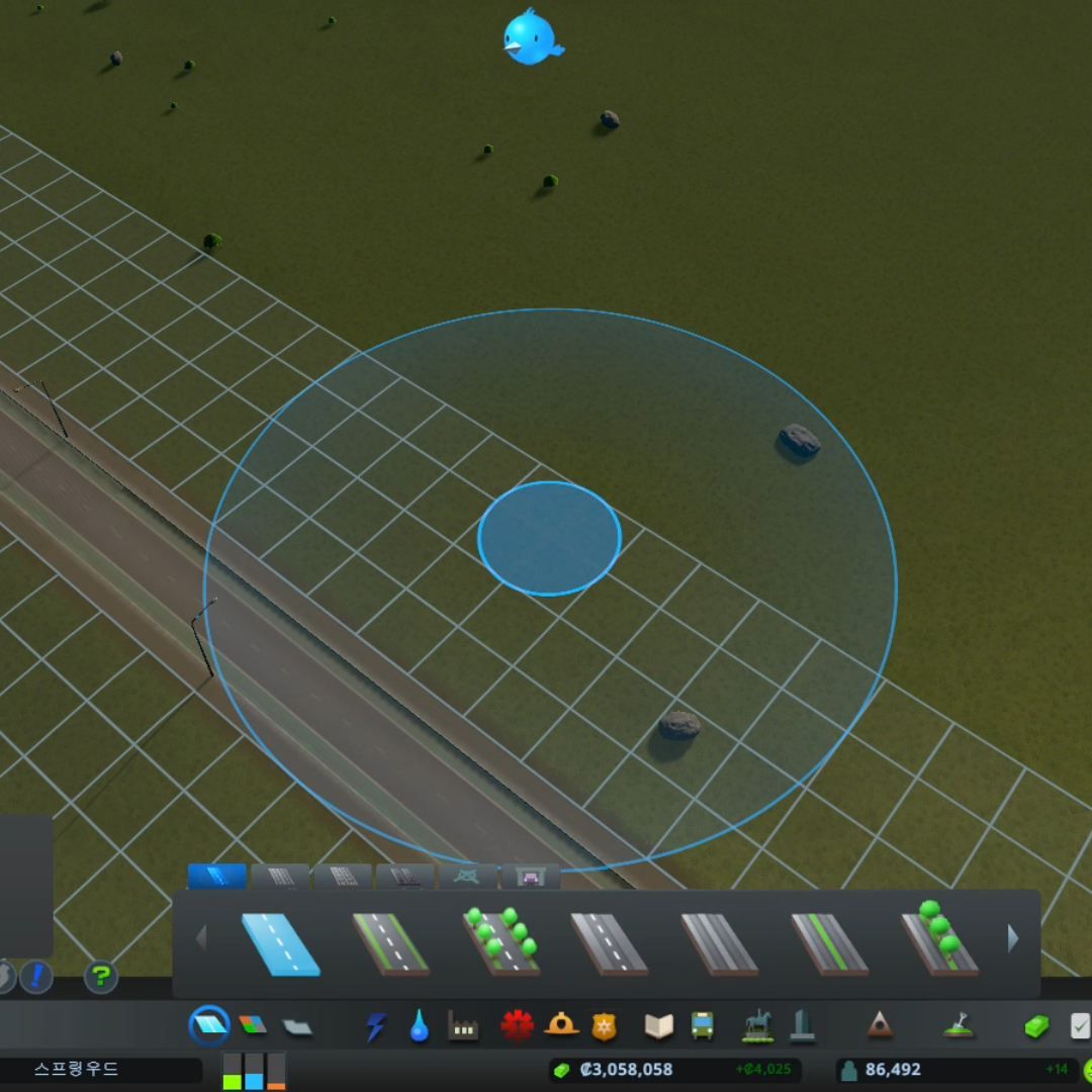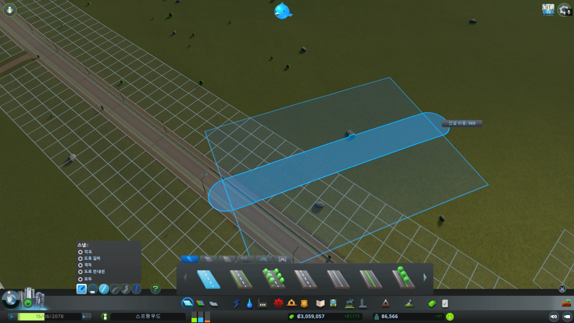 만약 "격자" 옵션이 켜져있다면 위 사진처럼 도로가 자동으로 격자에 딱딱 맞춰서 지어지지만, 끈다면 격자와 상관 없이 자유롭게 이동이 가능하다.