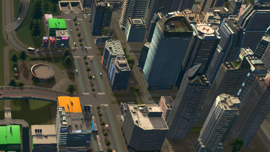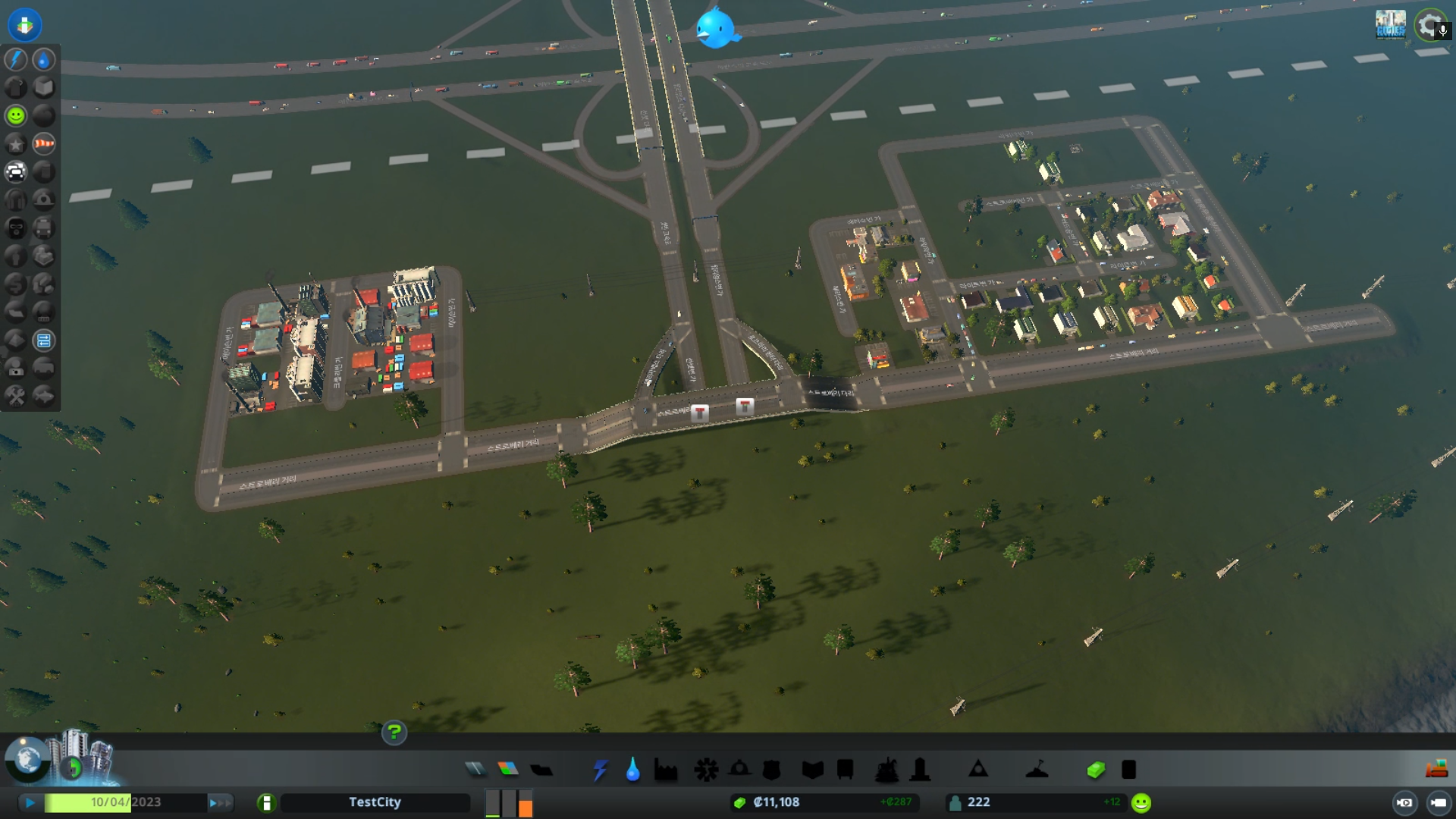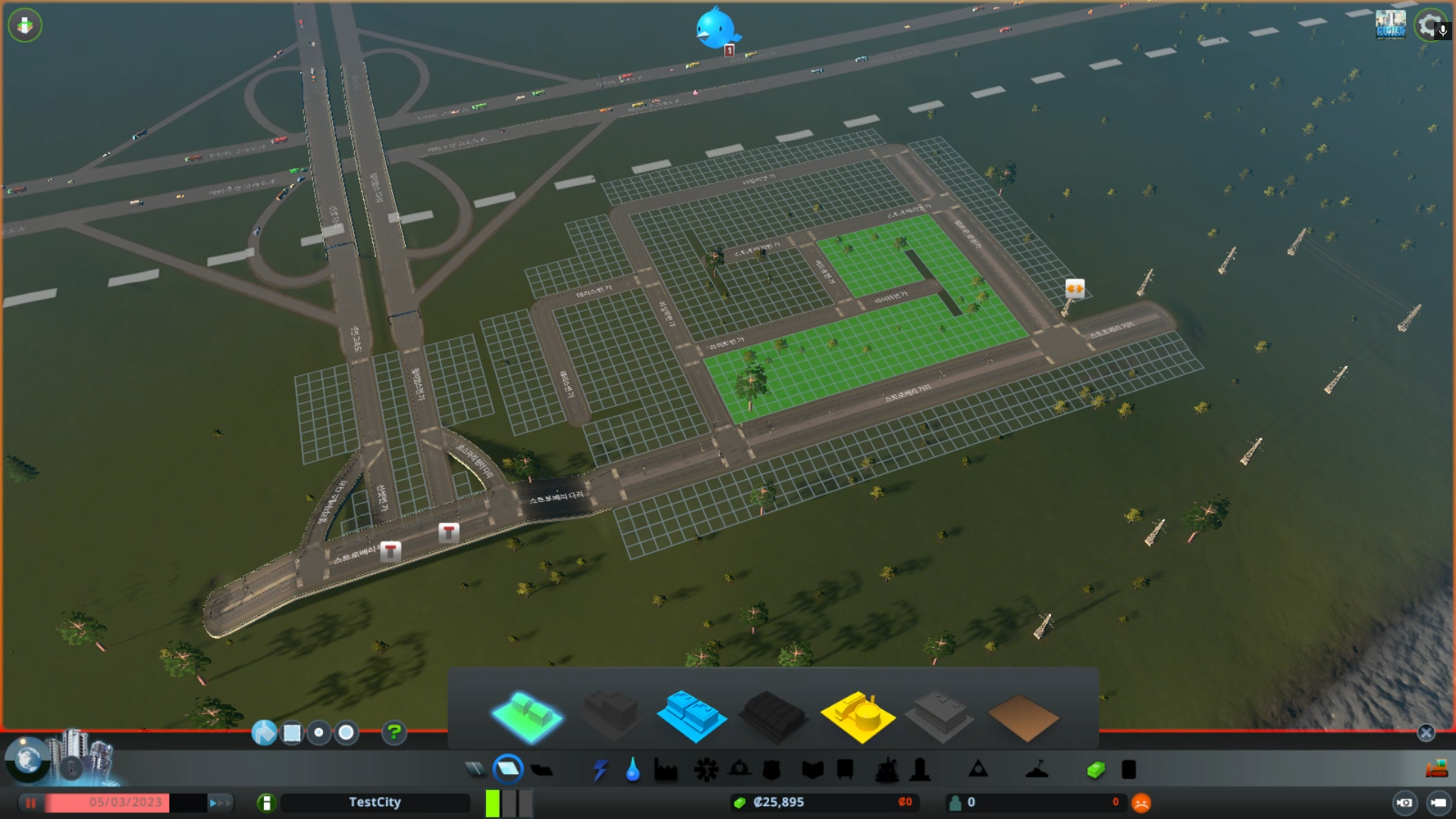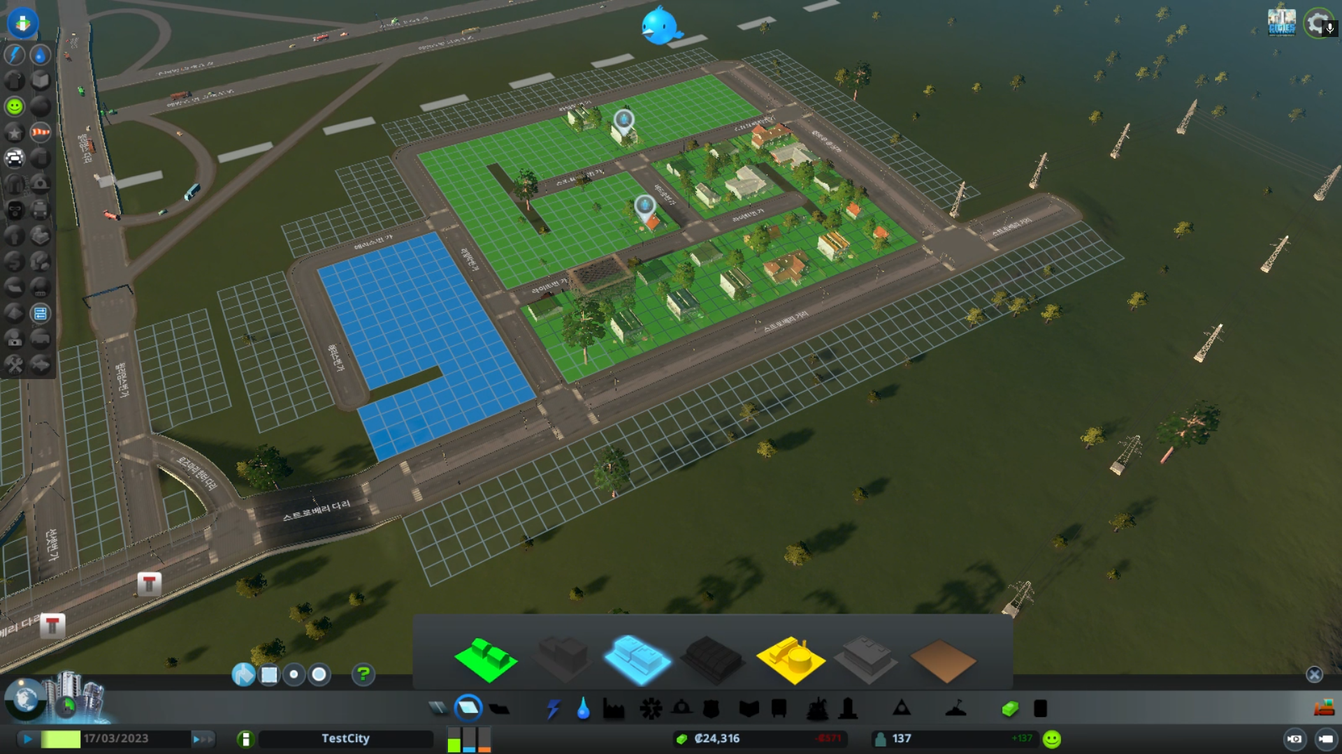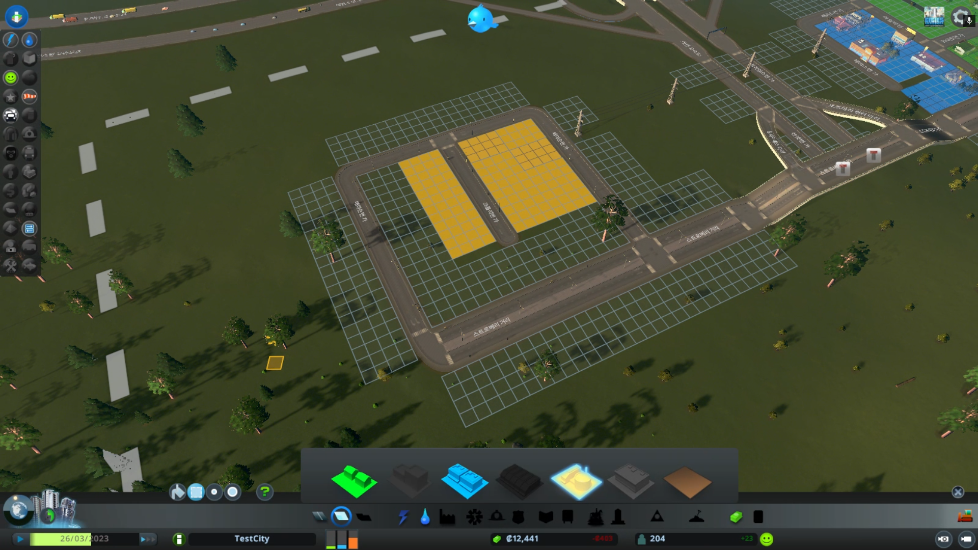 도로망 설계를 어느정도 마쳤다면 주거구역을 설정해준다. 고속도로를 제외한 도로 양 옆으로는 4칸의 건설 영역이 생기는데, 이곳에는 자동으로 올라오는 주거/상업/산업 건물을 설정할수도 있고, 이후 해금될 공원, 학교, 경찰서같은 공공시설을 직접 설치할 수도 있다.
