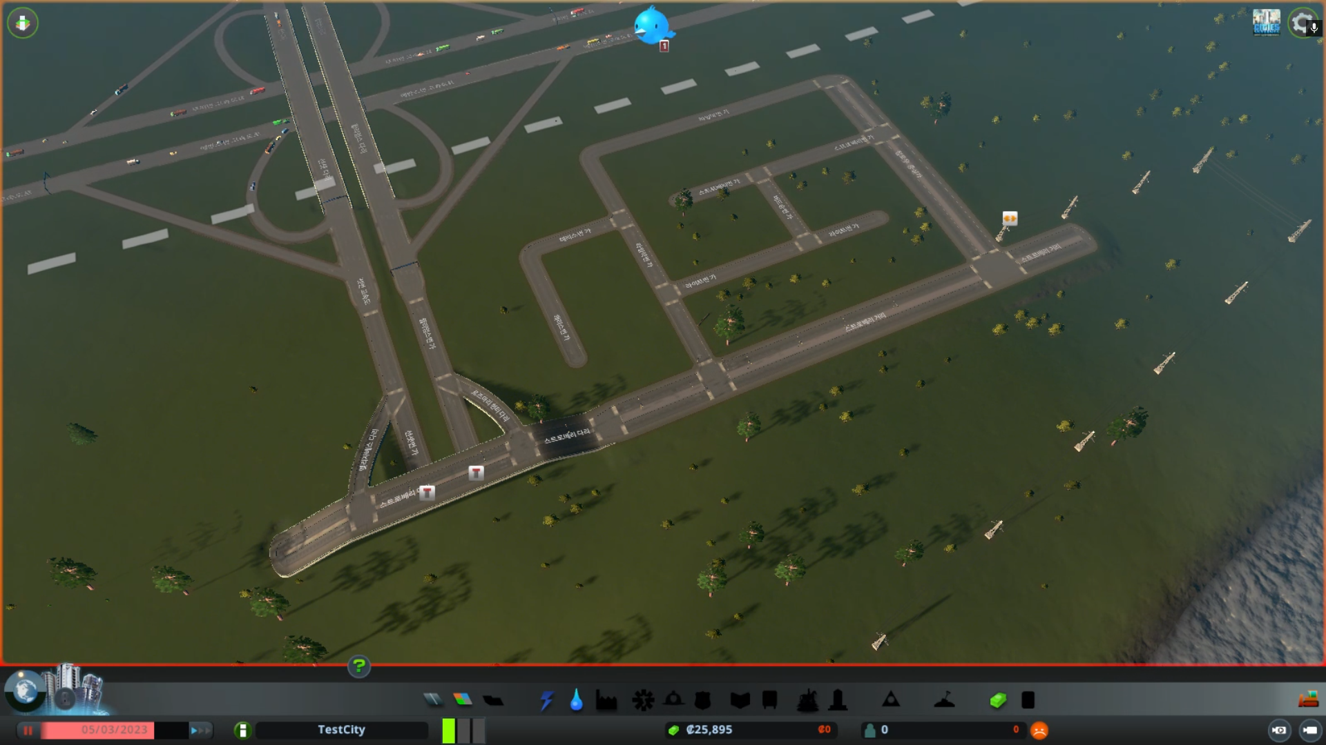 하지만 이렇게 하면 차량 뿐만 아니라 교통체증을 유발하지 않는 보행자들도 코앞에 있는 건너편 도로를 놔두고 빙 돌아가야 한다는 불편함이 생기는데, 이는 추후 레벨업하면서 해금되는 지형 툴에 있는 보행자도로로 해결할 수 있다. 위 사진처럼 본래 끊겨있는 도로에 인도를 연결해줌으로써 보행자들이 큰 길로 걸어나올 수 있게 만들었다.