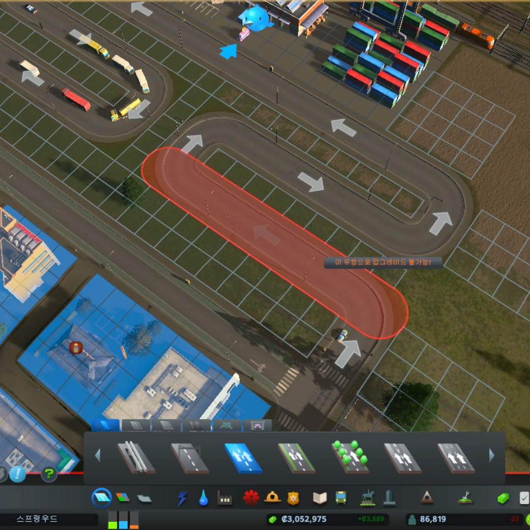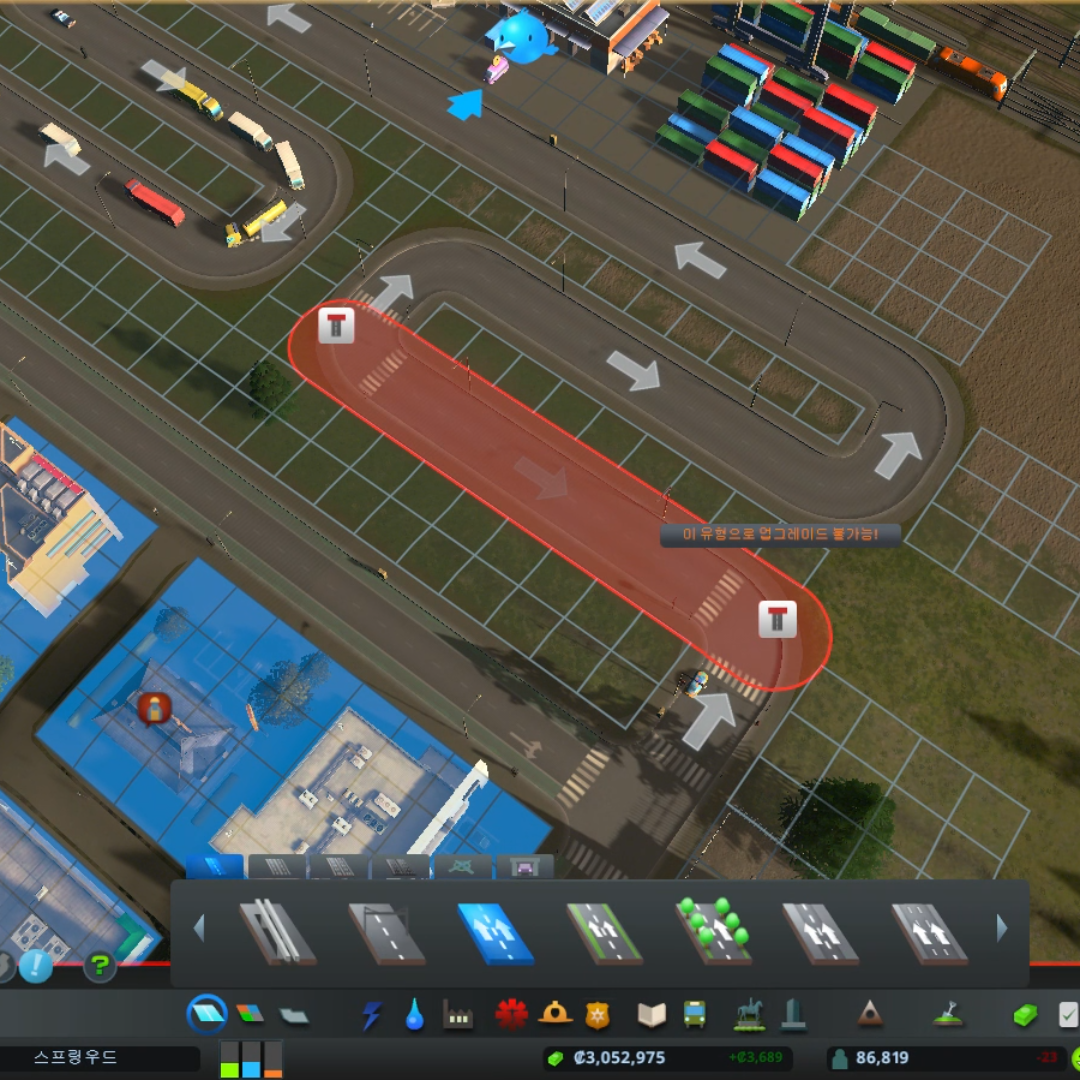 업그레이드 옵션은 일방통행 도로의 방향을 바꾸는데도 사용되는데, 도로에 마우스를 올린 상태에서 오른쪽 버튼을 누르면 된다. 번거롭게 철거하고 재설치할 필요가 없다.