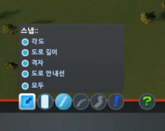 먼저 1번 버튼은 스냅 도구라고 부르는것인데, 도로를 만들때 다른 도로의 길이나 노드와 맞출것인지, 각도나 길이를 딱딱 맞출것인지 등등을 설정하는 용도이다. 구체적인 사용법은 아래와 같다.