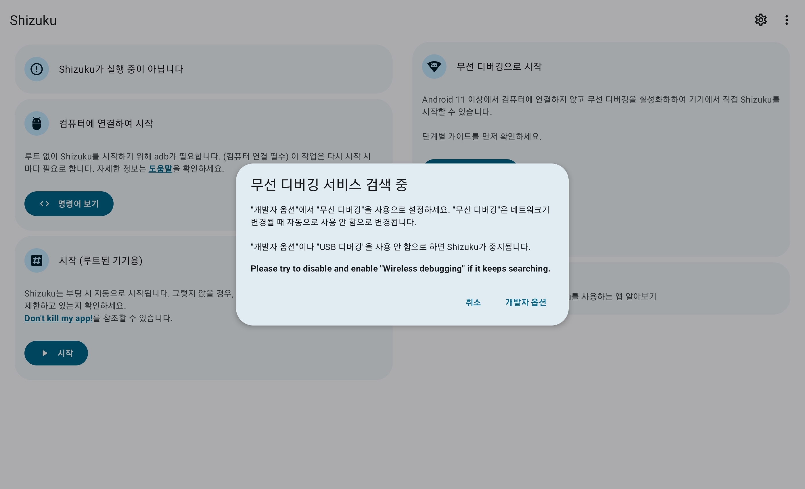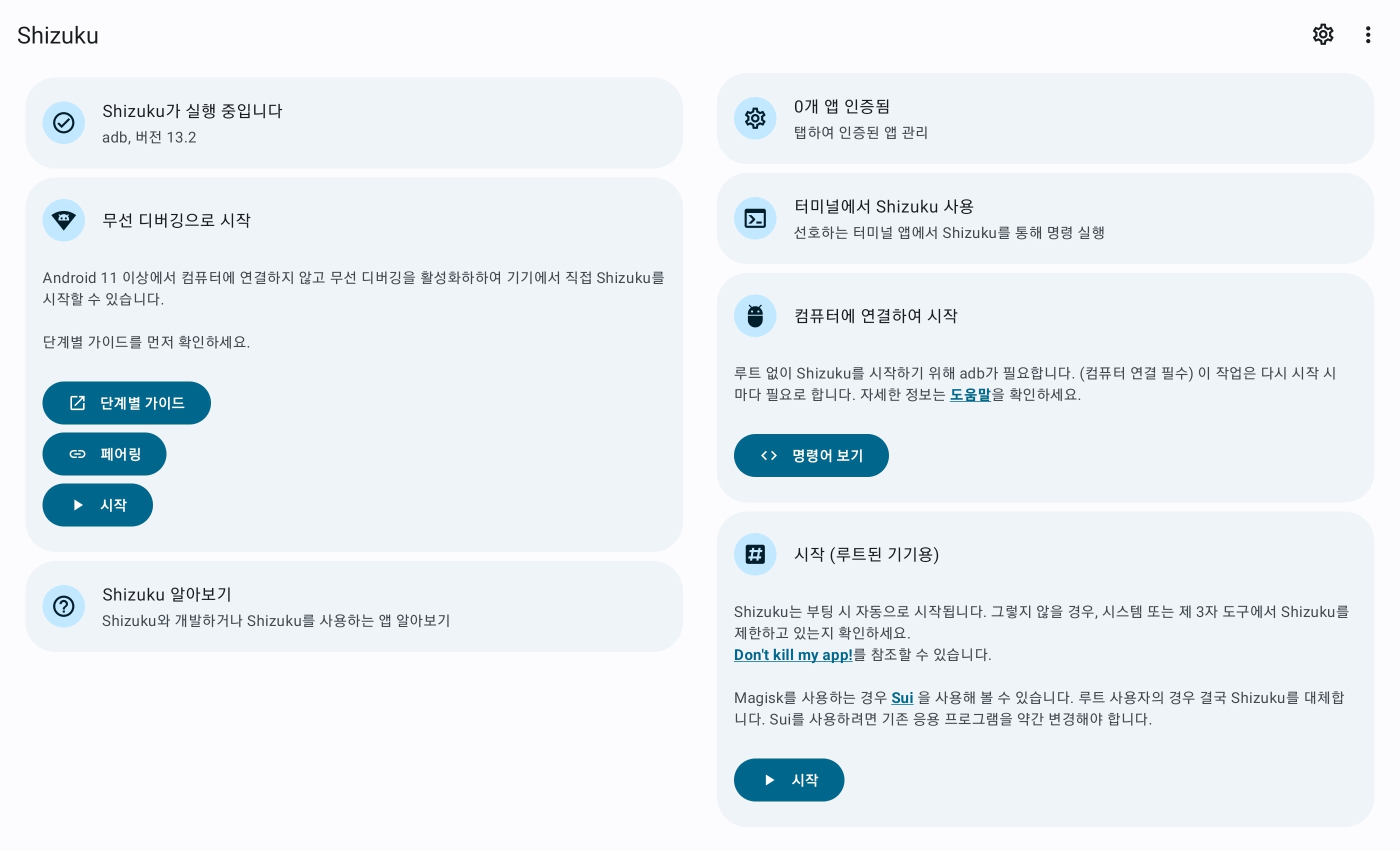 Shizuku를 실행해서 오른쪽 "무선 디버깅으로 시작" 밑에있는 페어링 버튼을 눌러, 안내에 따라 무선 디버깅을 진행한다.