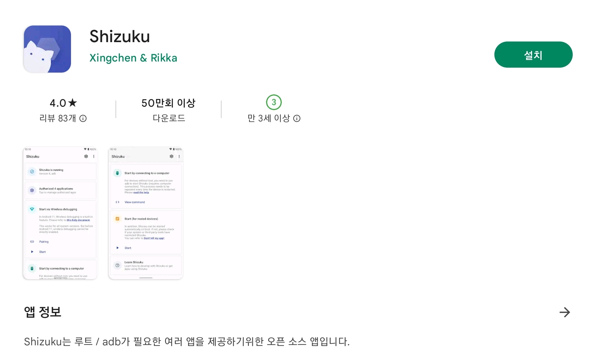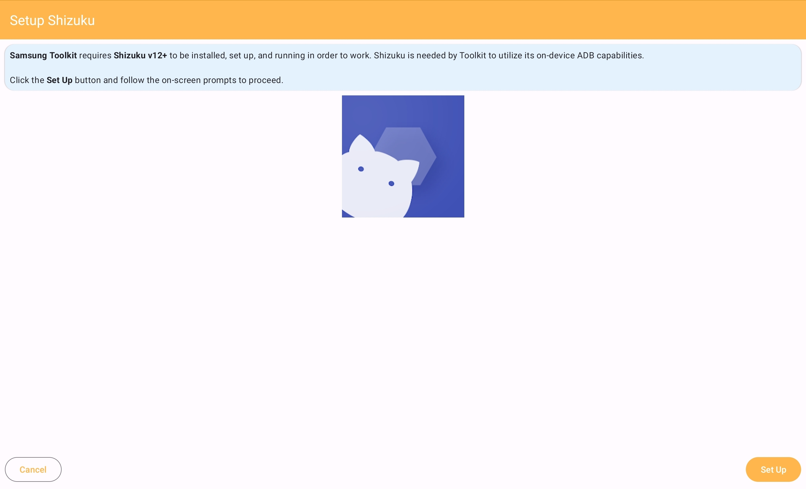 설치되었으면 Shizuku를 설정하라는 안내가 나오며, Set Up 버튼을 누르면 Shizuku로 넘어간다.