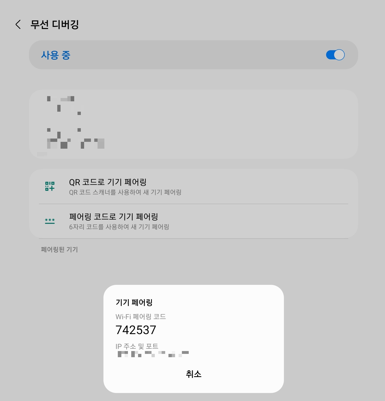 개발자 옵션 활성화 후, 무선 디버깅 옵션을 켠 다음 "페어링 코드로 기기 페어링"을 눌러 6자리 코드를 확인한 다음, 그 상태에서 상단바를 내려 "페어링 서비스를 찾았습니다" 알림에 코드를 입력하고 전송 버튼을 누른다.