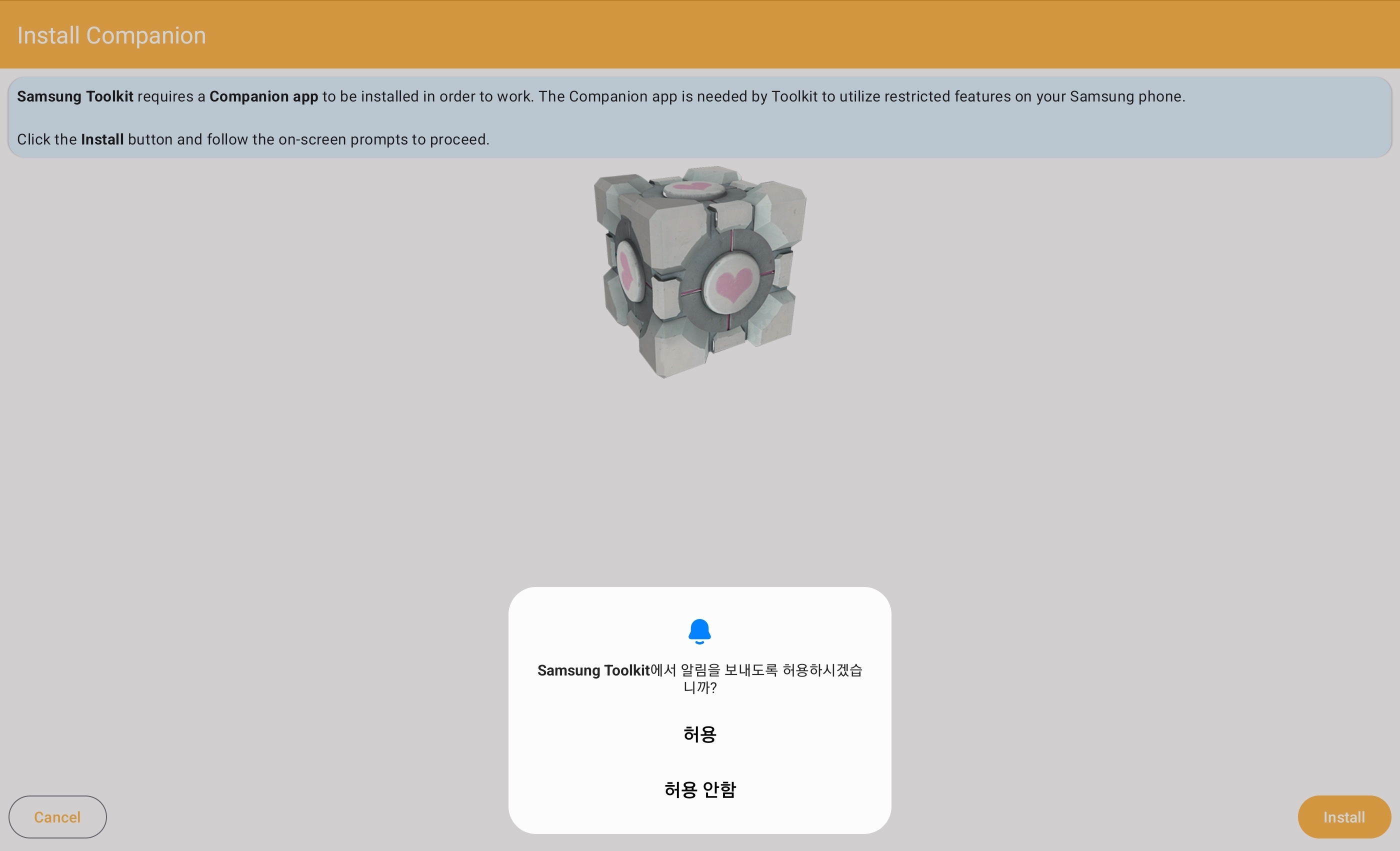 Samsung Toolkit를 열면 먼저 Companion 앱을 설치하라는 안내가 나오는데, install 버튼을 누르고 웹페이지로 넘어가서 apk 파일을 다운받고 설치한다.