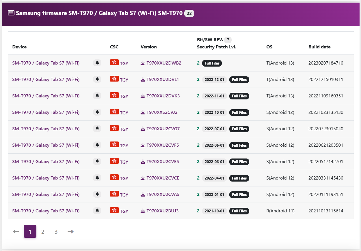 검색창에 모델명을 검색한 후 본인의 기종이 맞는지 확인한 다음, Hong Kong SAR (TGY)에 들어가서 부트로더 버전이 같고 (즉 버전 중간부분이 U2로 동일하고) One UI 버전이 5.0보다 낮은 (안드로이드 12 권장) 롬 파일을 아무거나 다운받는다.