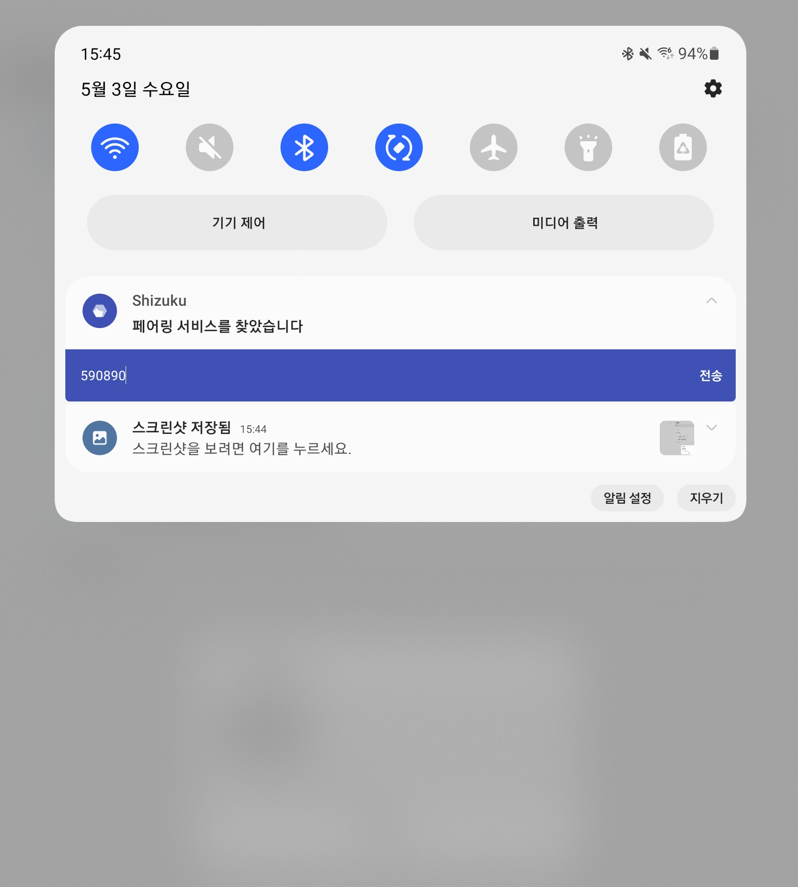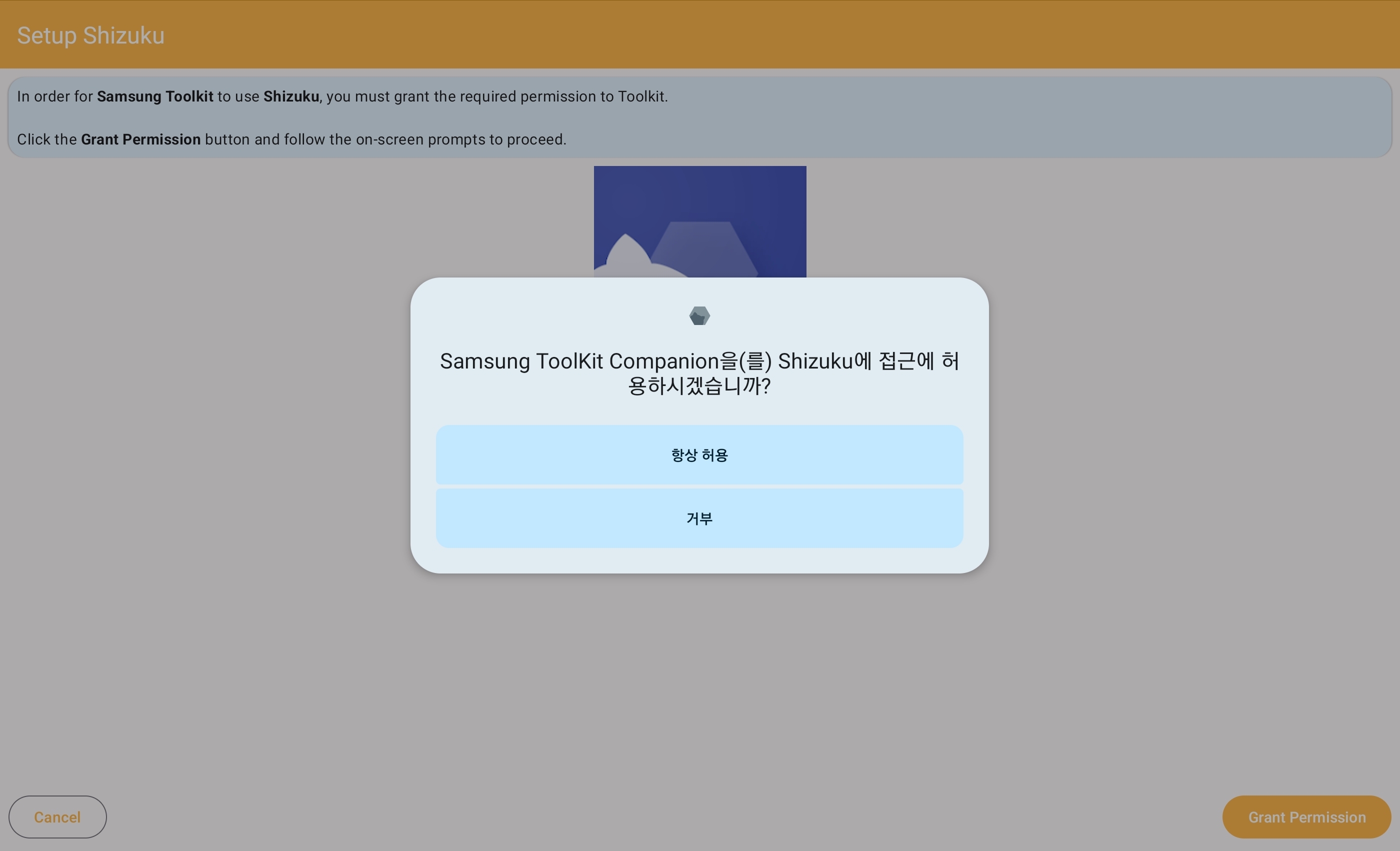 다시 Shizuku로 돌아와 페어링 버튼 밑의 "시작" 버튼을 누르면 Shizuku가 실행되며, Samsung Toolkit에 접근 허용까지 해주면 Samsung Toolkit까지 활성화된다.