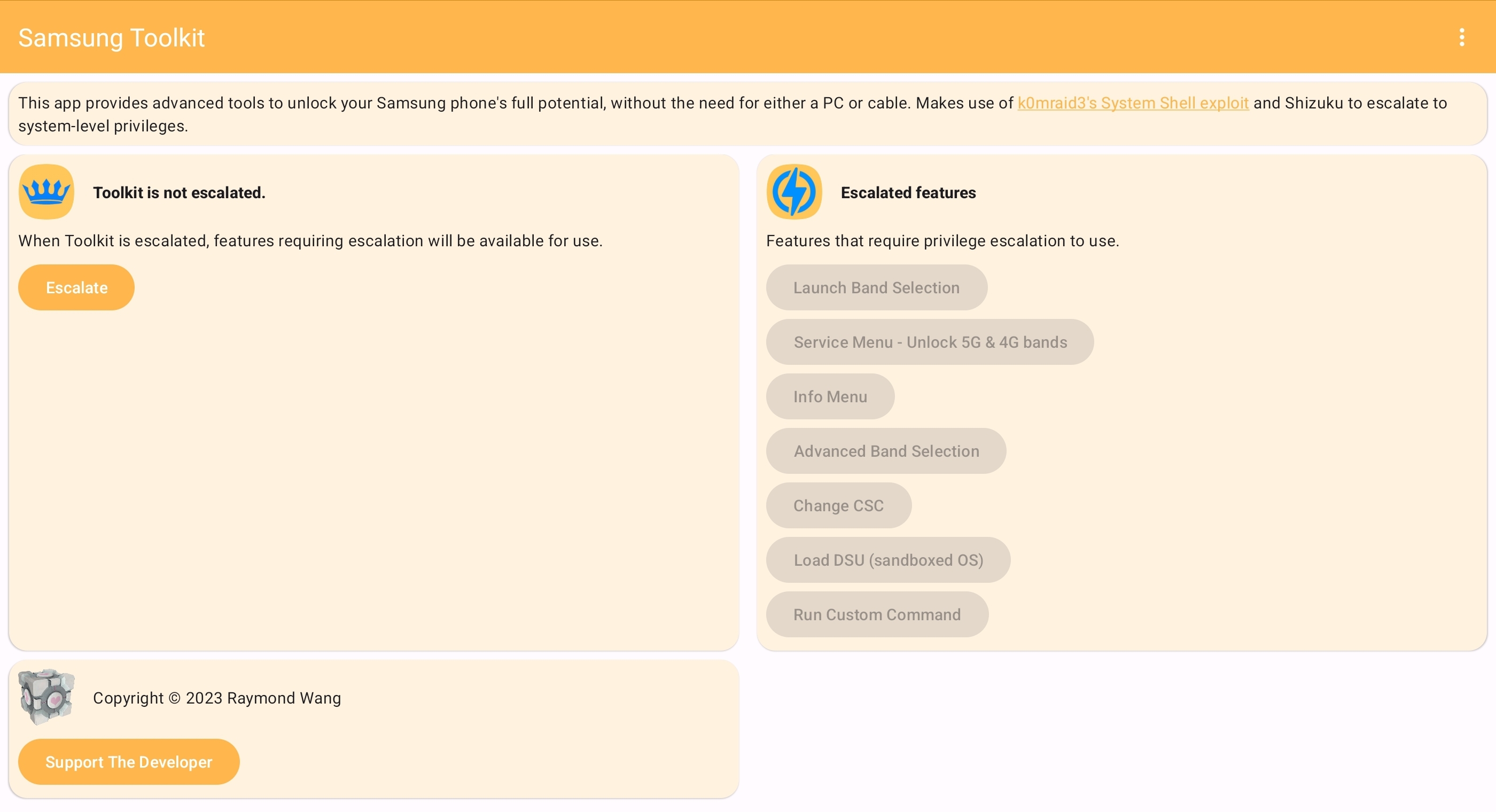 왼쪽의 Escalate 버튼을 눌러 권한 획득을 진행하면 오른쪽의 메뉴들이 활성화된다. 주의할점은 Escalate 과정이 끝날때까지 화면에 무엇이 나오든 아무것도 건드려서는 안되며, 화면이 꺼졌을때 전원 버튼을 눌러 켜는 것 정도는 괜찮으나 만일의 사태를 방지하기 위해 차라리 미리 설정에서 화면 꺼지는 시간을 늘리는걸 추천한다.