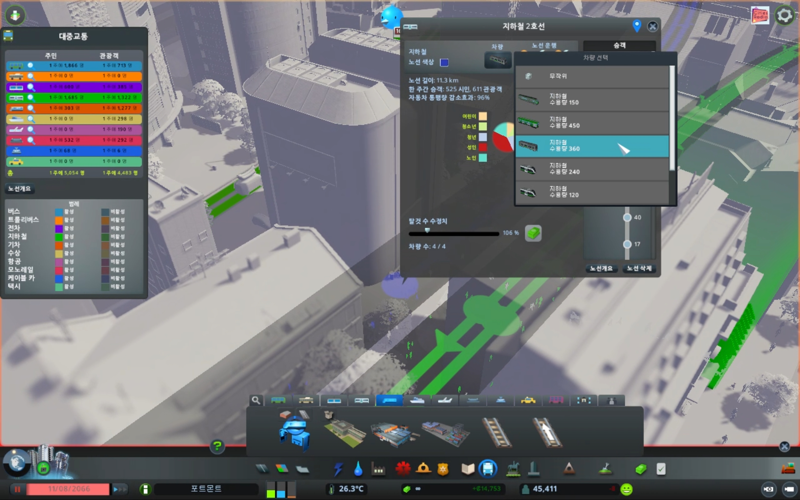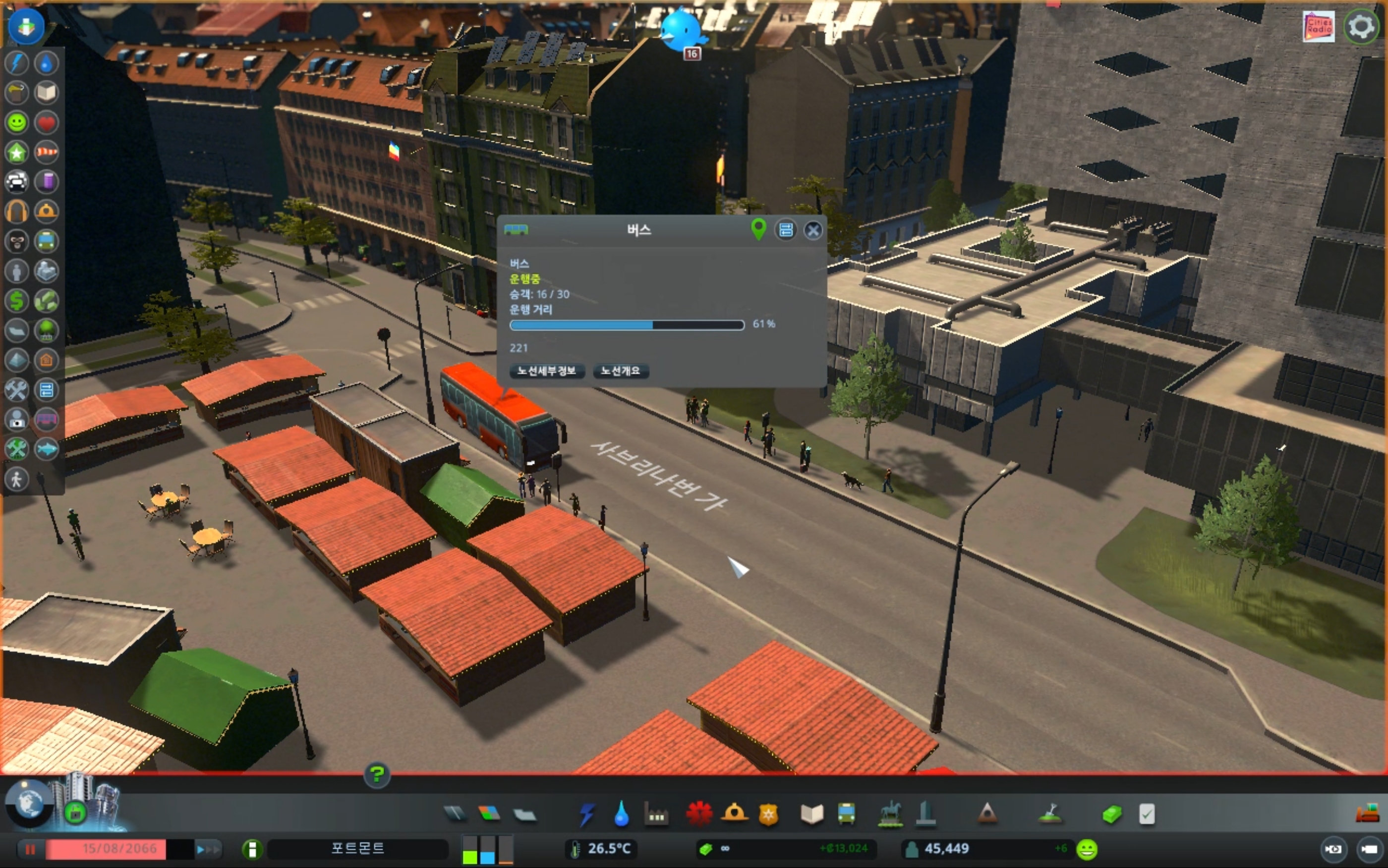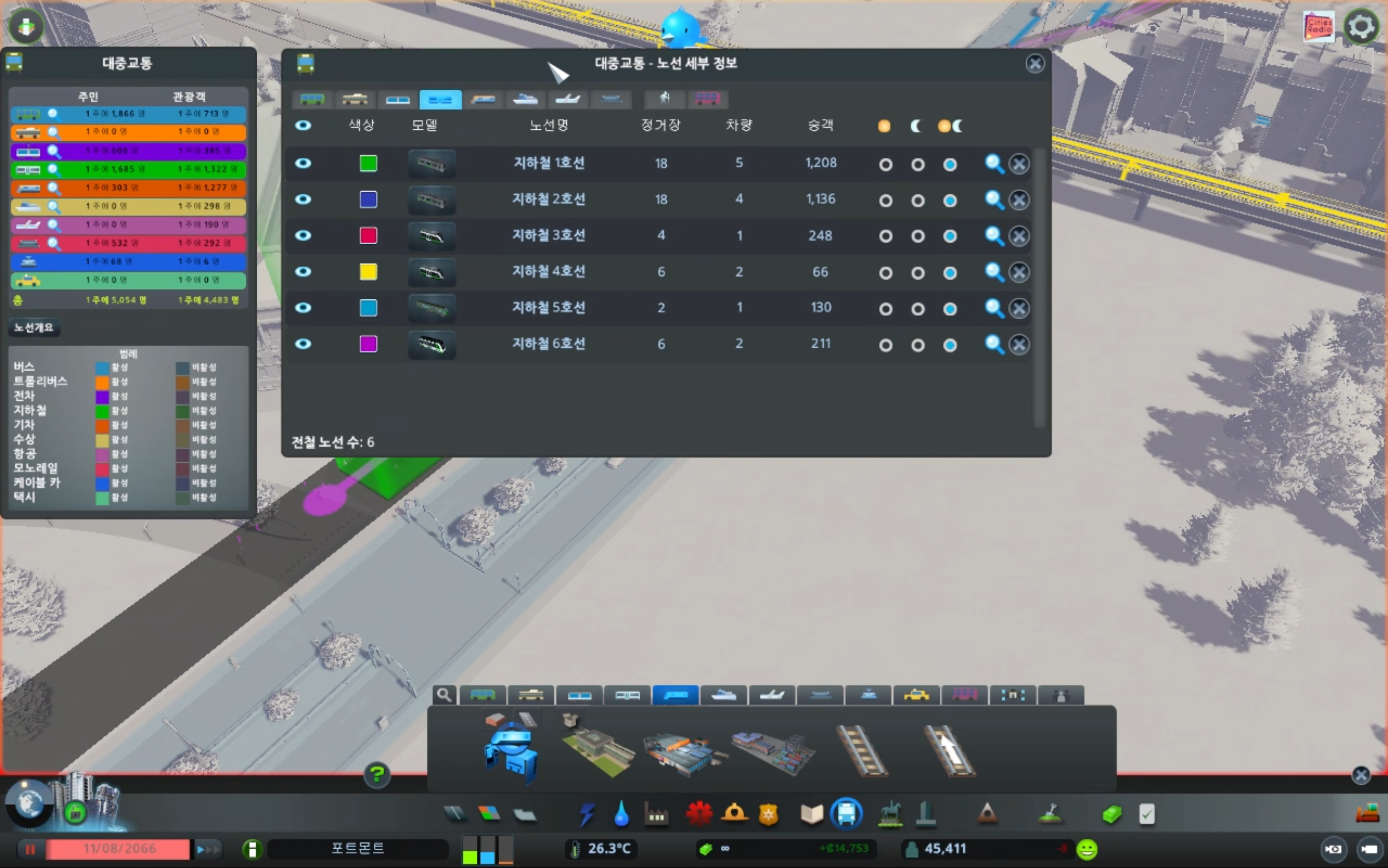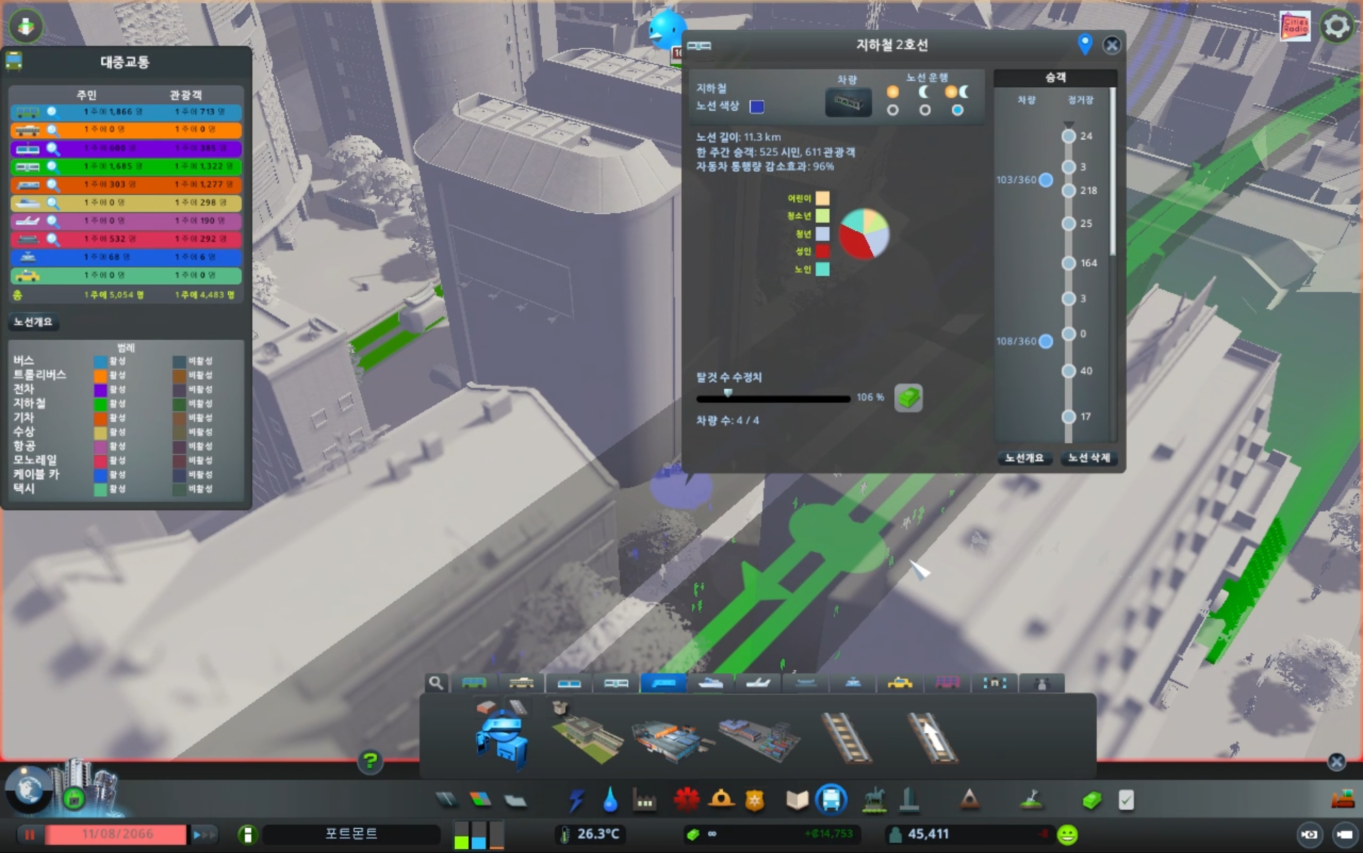 저기서 맨 오른쪽에 돋보기 버튼을 누르면 해당 노선의 각 정류장별 승객 수와 전체 승객의 나이대를 파악할 수 있고, 노선 색깔과 차량 종류를 설정하거나 예산 조절을 통해 운영하는 차량 댓수를 조절할 수 있다.