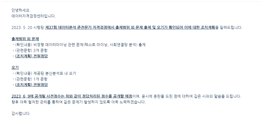 그렇게 주말동안 시험에 대해 잊고 지내다가, 월요일에 호기심에 카페에 들어가보니 출제오류와 범위 외 시험문제 출제로 시끄러워있었다. 알고보니 사회연결망 분석과 텍스트 마이닝은 나만 공부를 안한게 아니라 애초에 ADsP의 범위가 아니라서 나오면 안되는 문제였고, 마지막 문제에서 분산분석표에 0이 하나 빠진 오류도 있었다고 한다.