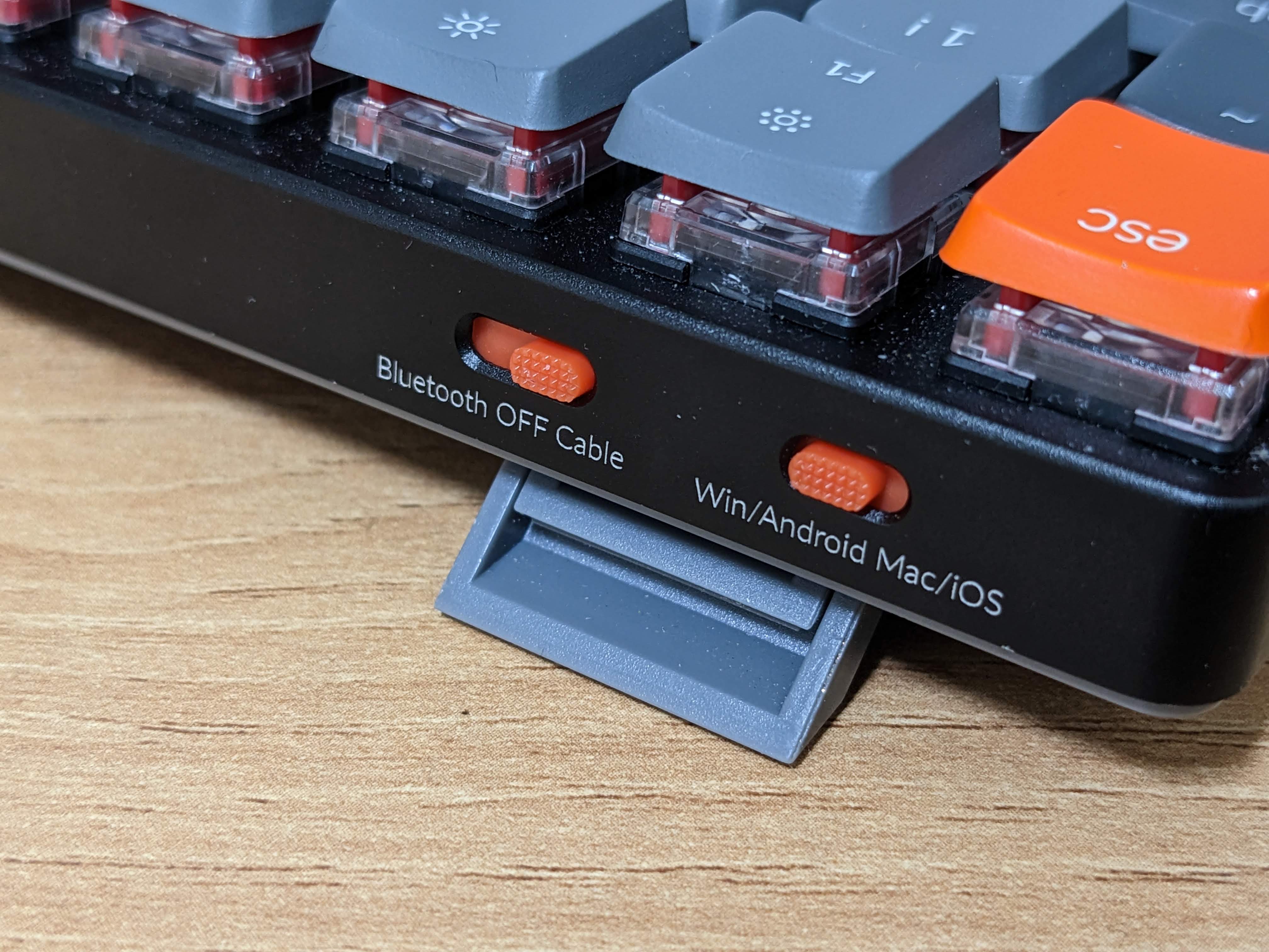 뒷면 정중앙에는 충전과 유선 연결이 가능한 C타입 단자가 있고, 왼쪽에는 연결 종류 (블루투스/유선/끔) 와 연결 운영체제 (윈도우&안드로이드/맥&iOS) 를 선택하는 스위치가 있다. 참고로 절전모드를 지원해서 매번 번거롭게 켜고 끌 필요는 없다.