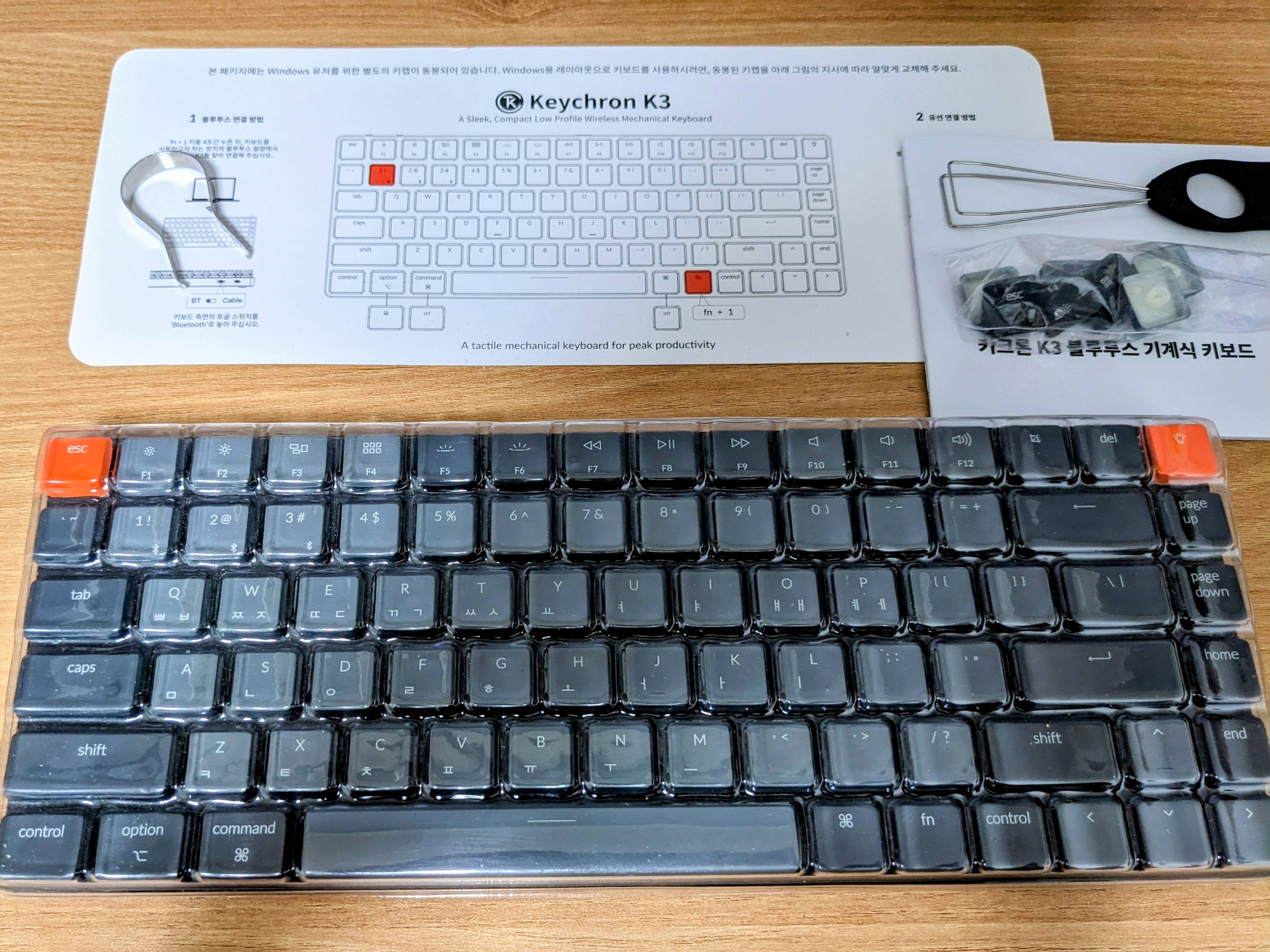 구성품으로는 키보드 본체, 아크릴 케이스, 윈도우용 키캡, 회색 esc와 백라이트 키캡, 키캡 리무버, 초기 사용 안내도, 사용 설명서 정도가 있다. 케이스는 모서리가 깨져서 결합이 잘 안되는건지 아님 원래 저렇게 대충 얹어놓는 용도인지는 모르겠다.