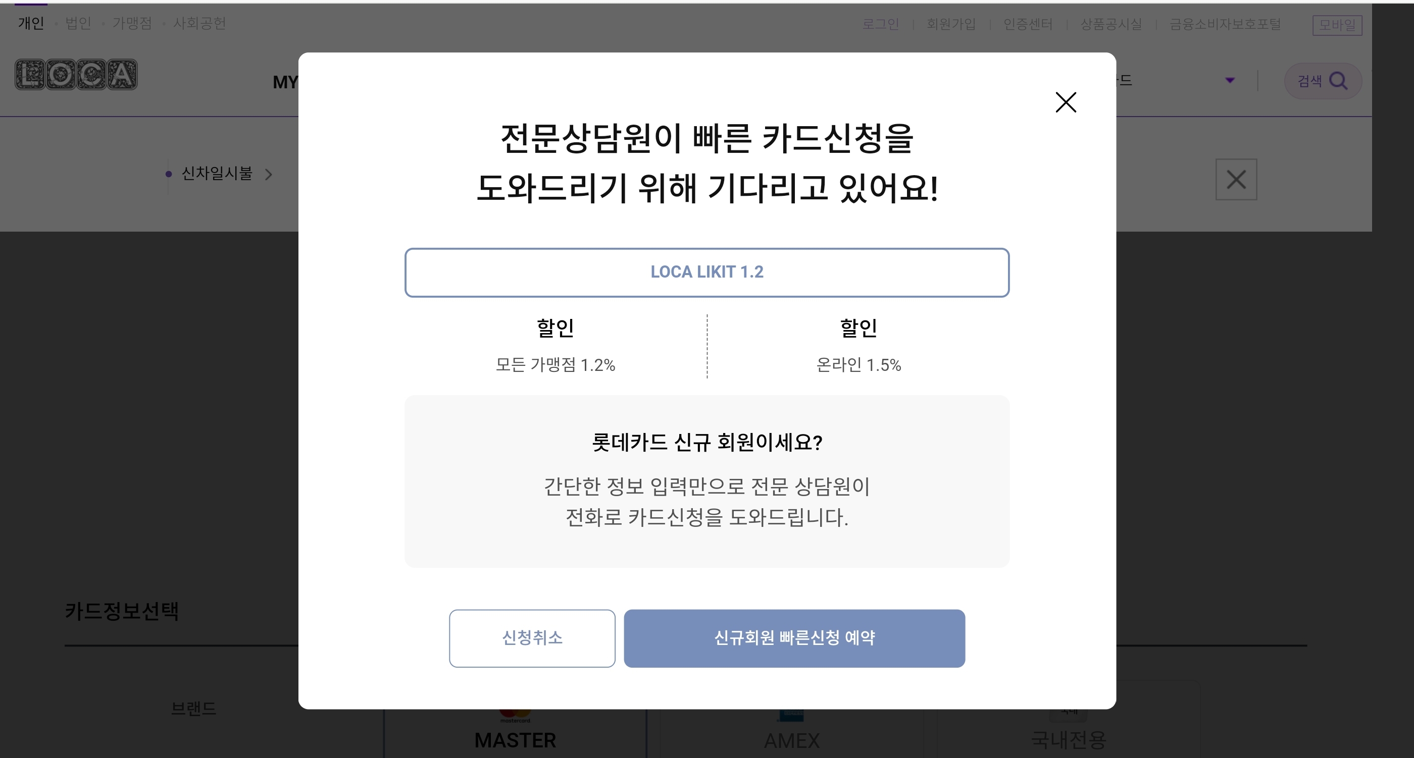 빠른 카드신청 ARS번호 1588-8700로 전화를 걸거나, 위 사진처럼 카드 신청 페이지에서 페이지 내 아무 링크를 누르면 카드 신청하려는 사람을 하나라도 더 붙잡기 위해 뜨는 상담원 연결 예약창을 통해 카드신청 예약이 가능하다.