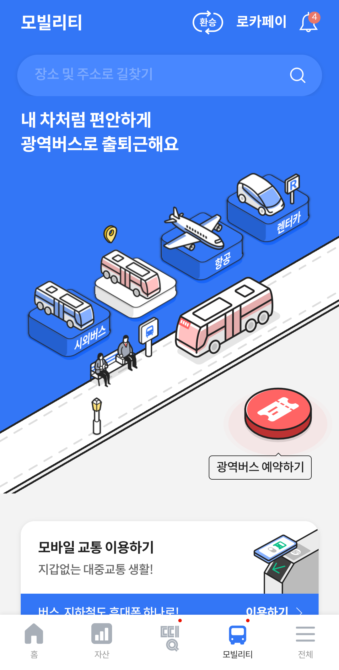 또한 로카모빌리티가 롯데카드의 자회사인 만큼 모바일 교통카드 기능의 사용을 적극적으로 유도하고, 광역버스와 시외버스 예약 기능이 기본적으로 내장되있다는 특징이 있다.
