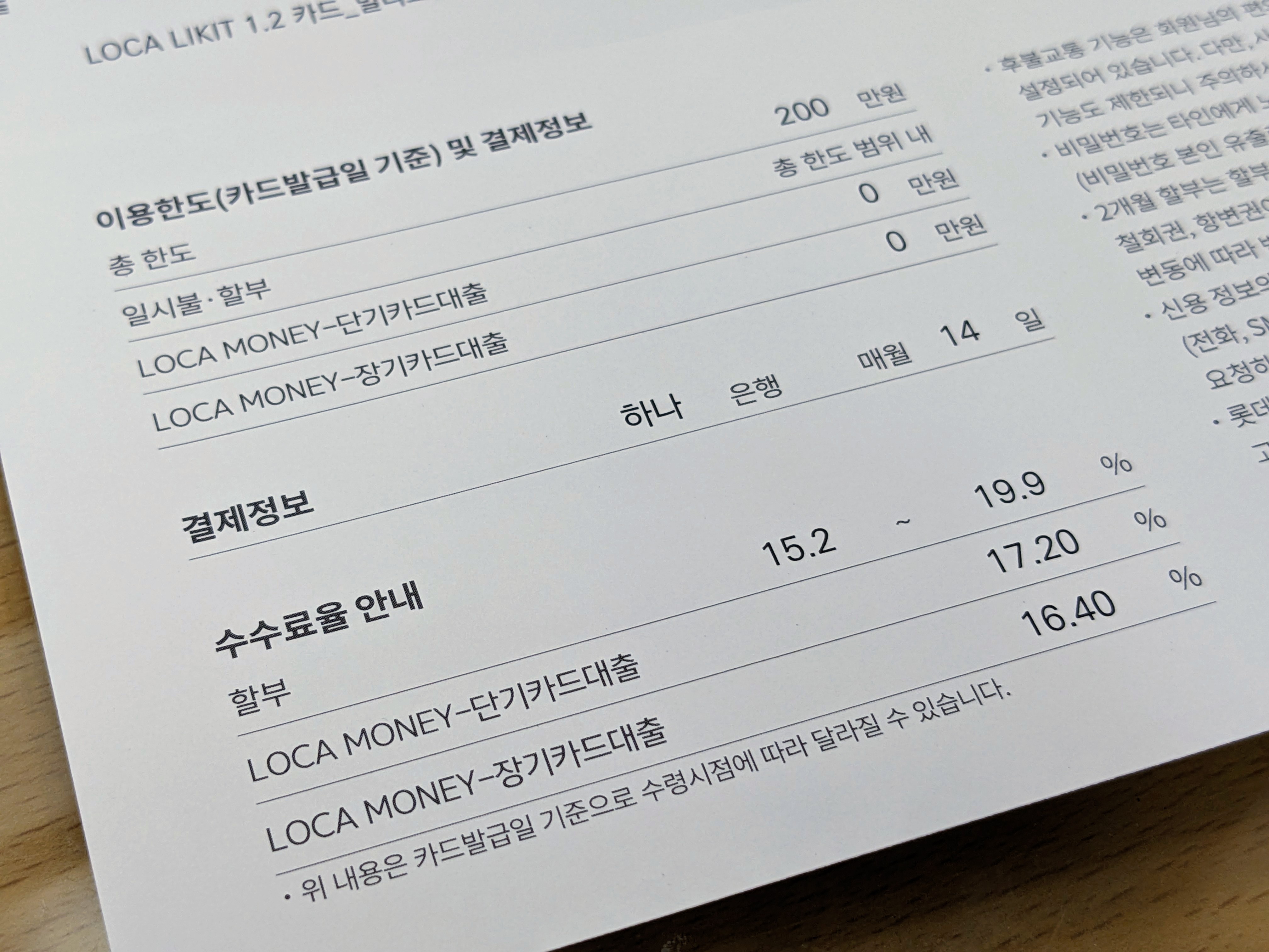 신용정보가 적은 만큼 한도는 코딱지만큼 나왔다. 뭐 어차피 월 평균 카드 소비금액은 저거의 1/10정도밖에 안쓰겠지만. 그리고 유이자할부랑 카드대출은 원래 쓸 생각도 없었지만 수수료가 생각보다 사악해서 더더욱 쓸 마음이 사라졌다.