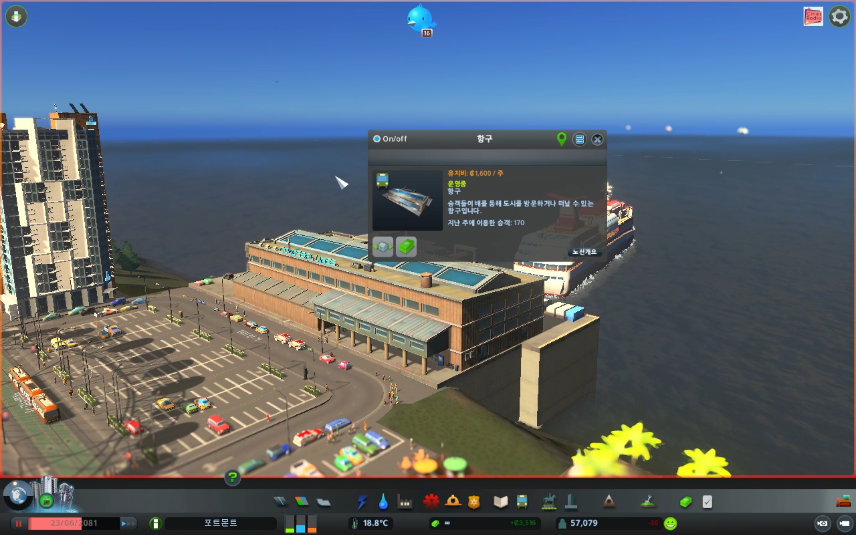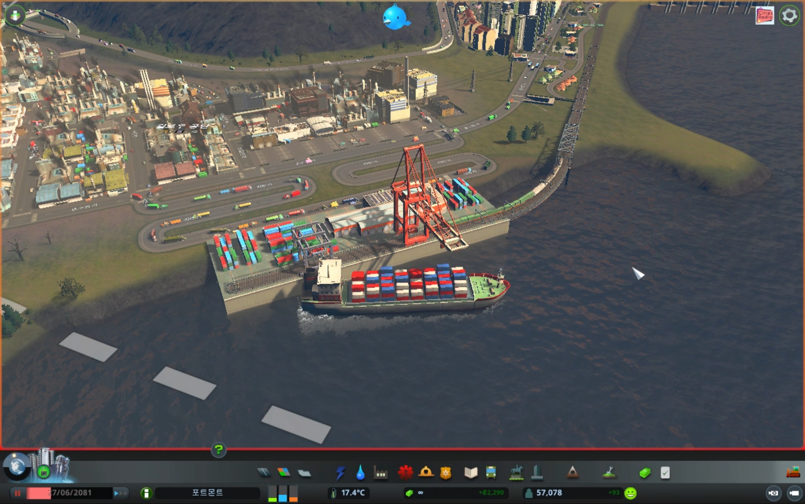 기차, 공항과 마찬가지로 도시 외부에서 승객들과 화물들을 싣고 나르는 교통수단. 항구는 선박이 드나들 수 있는 해안가에 지어야 할 뿐만 아니라, 맵에 기본적으로 지정되있는 선박 항로 (항구 설치 시 나타나는 노란색 점선) 와 연결이 가능해야해서 입지 선정이 의외로 까다롭다. 간혹 물은 있는데 항로가 없는 맵들이 있는데, 이런 맵들은 모드를 통해 항로를 만들어주지 않는 이상 어디에도 항구를 설치할 수 없다.