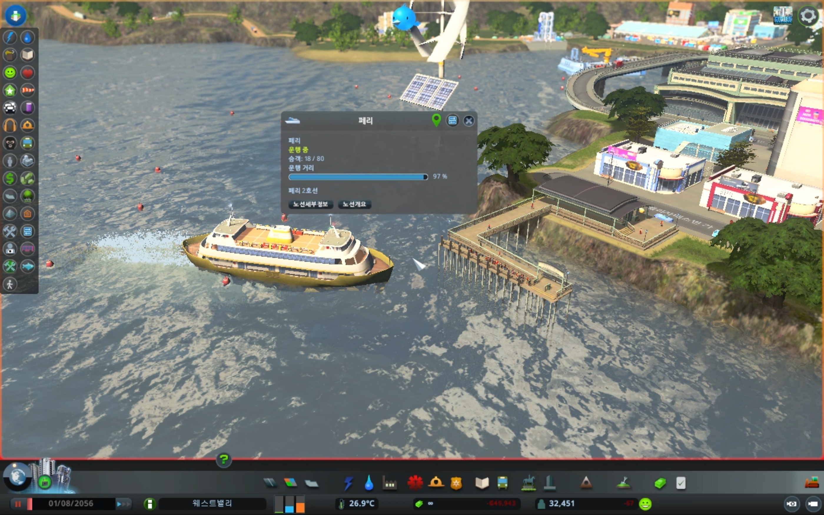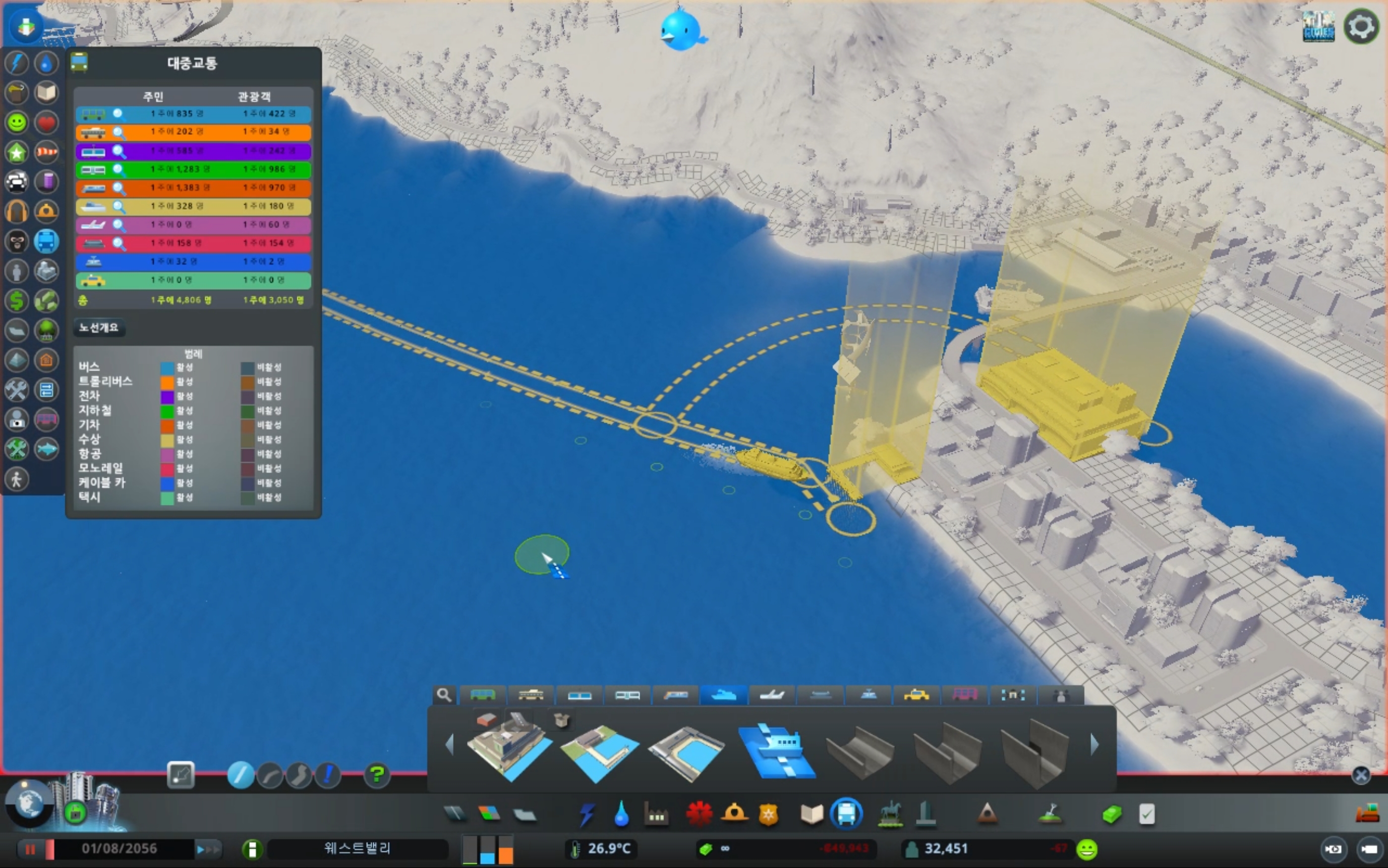노선 설정 방법은 비행선이나 헬리콥터와 매우 유사한데, 정류장 역할을 하는 페리 기착지/부두를 짓고 경로 지정 도구로 물 위에 경로를 설정해준 다음, 차고지 역할을 하는 페리 기점을 지어서 경로에 연결해주고, 노선 지정 도구로 경로를 따라 기착지/부두를 잇는 노선을 만들어주면 끝.