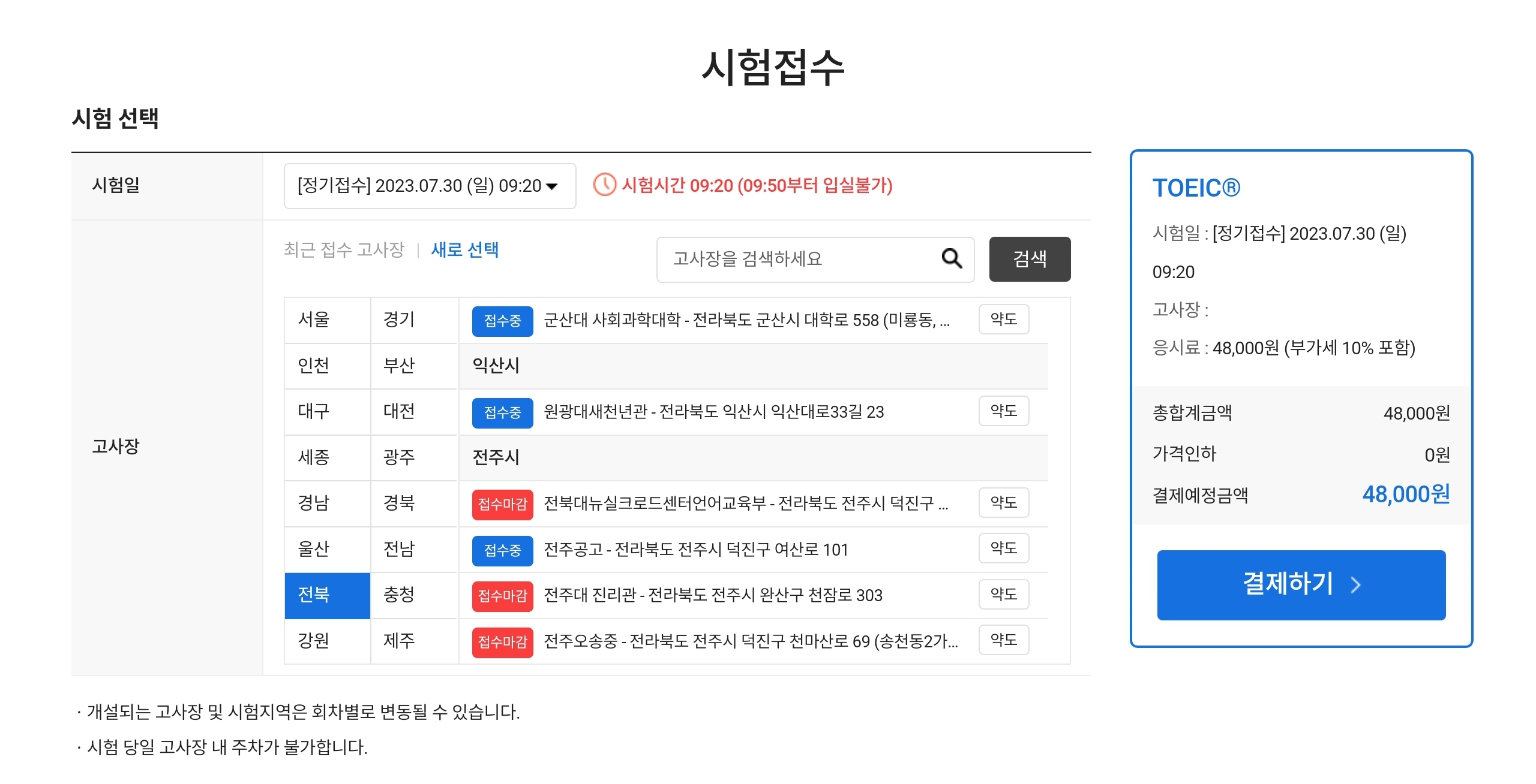 위치나 환경이 좋은 시험장은 일찍 마감이 된다. 특히 대학생들 방학 기간에는 토익 응시자가 많아 사진처럼 시험까지 20일 가량 남았는데 접수가 마감된 고사장이 여럿 보일 정도. 거기다가 늦게 접수하면 응시료가 비싸지니 가급적 미리미리 시험을 응시해놓자.