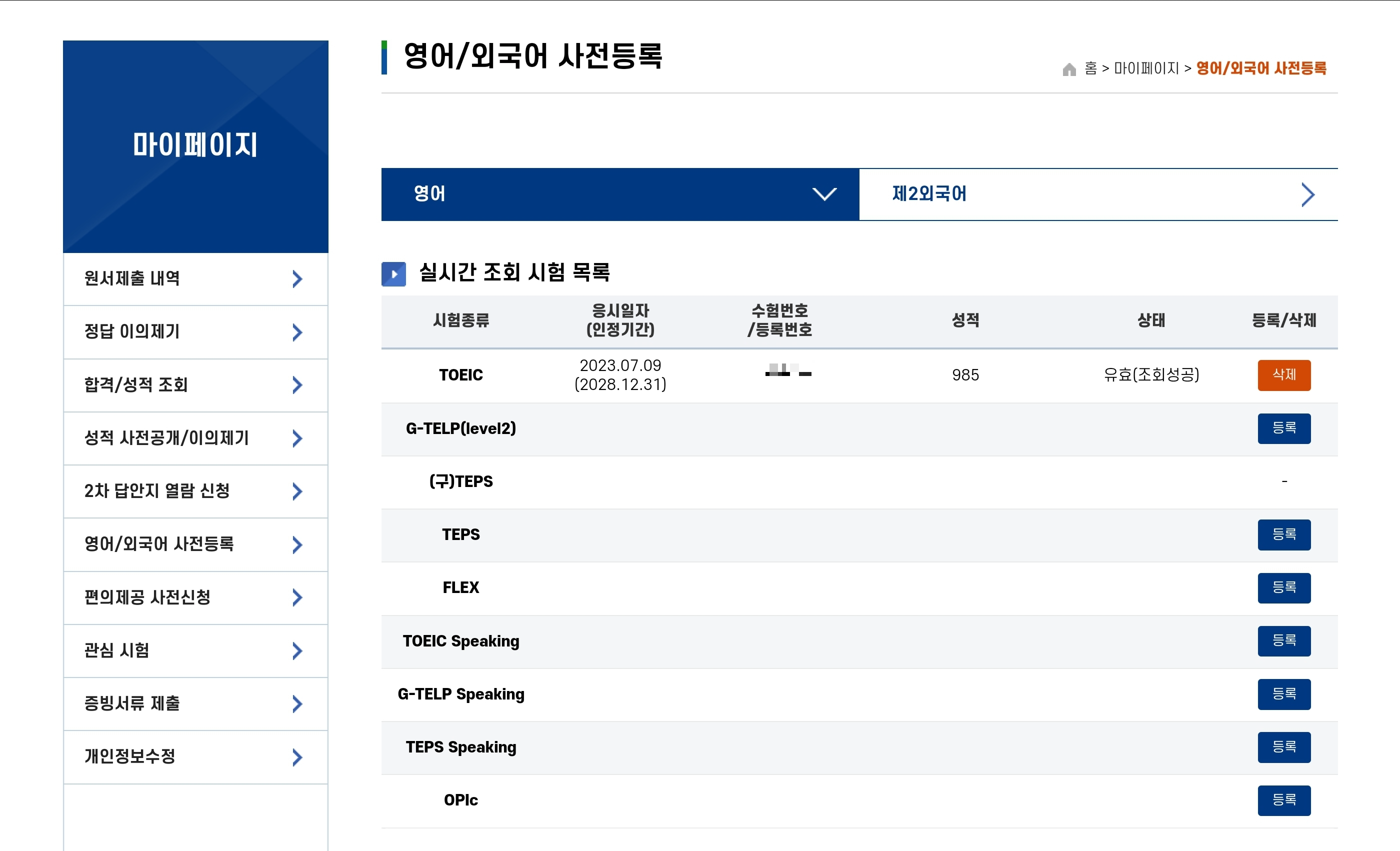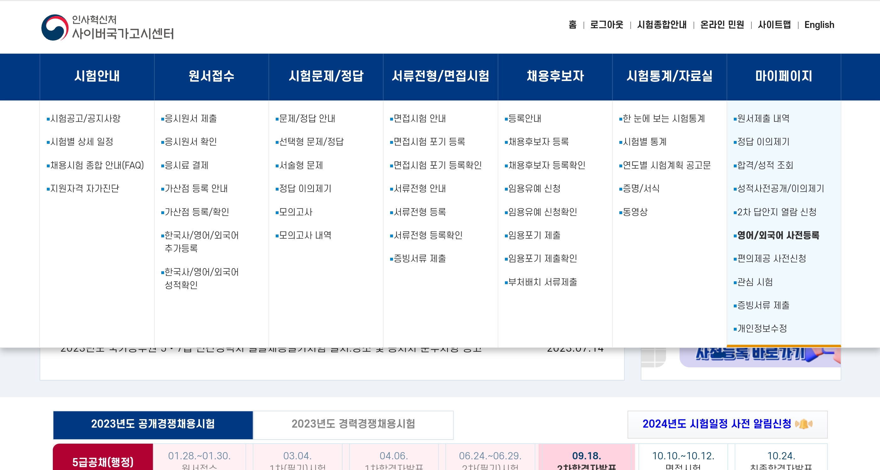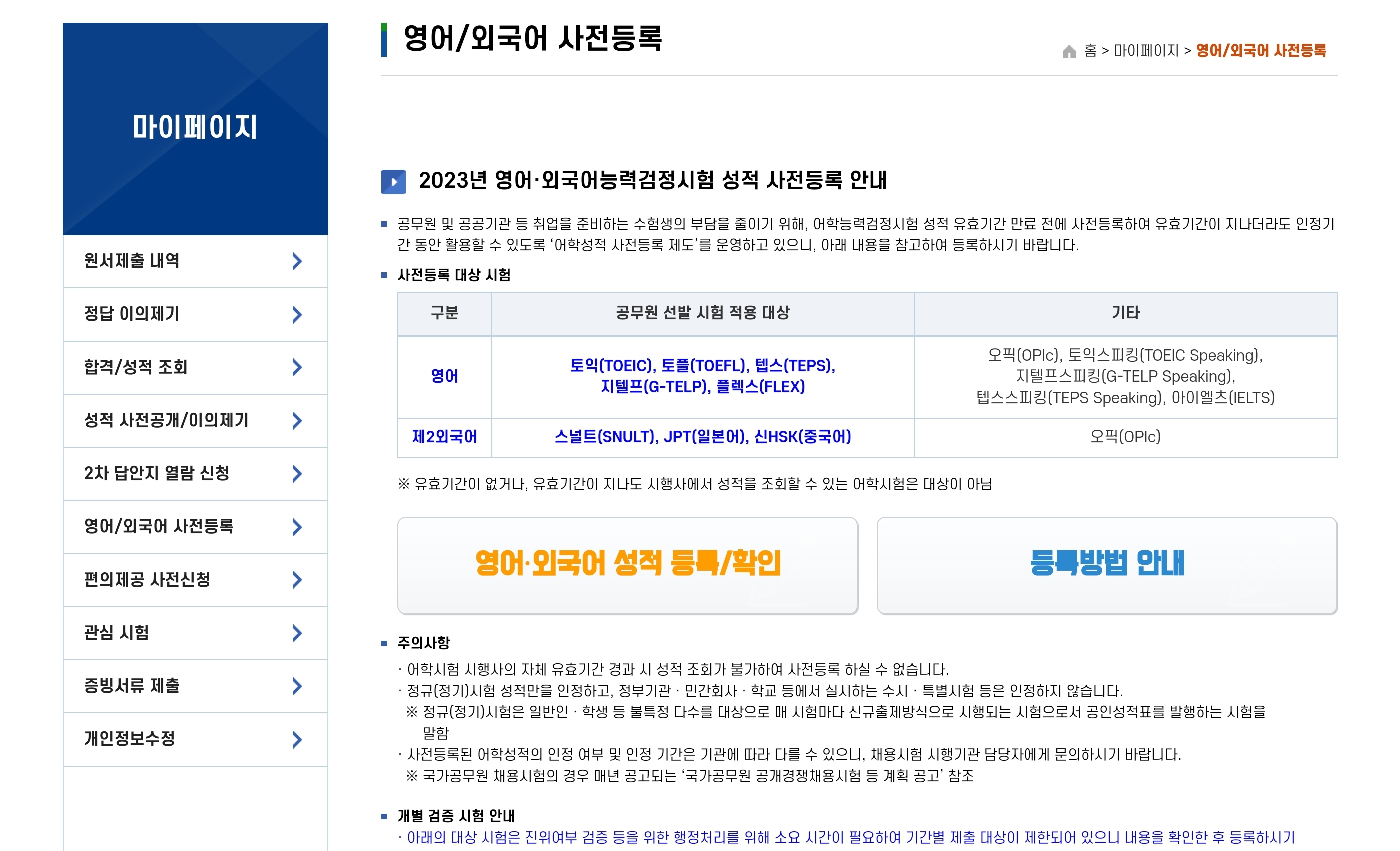 인사혁신처 사이버국가고시센터 사이트에 회원가입 후 마이페이지-영어/외국어 사전등록 메뉴로 들어간다.