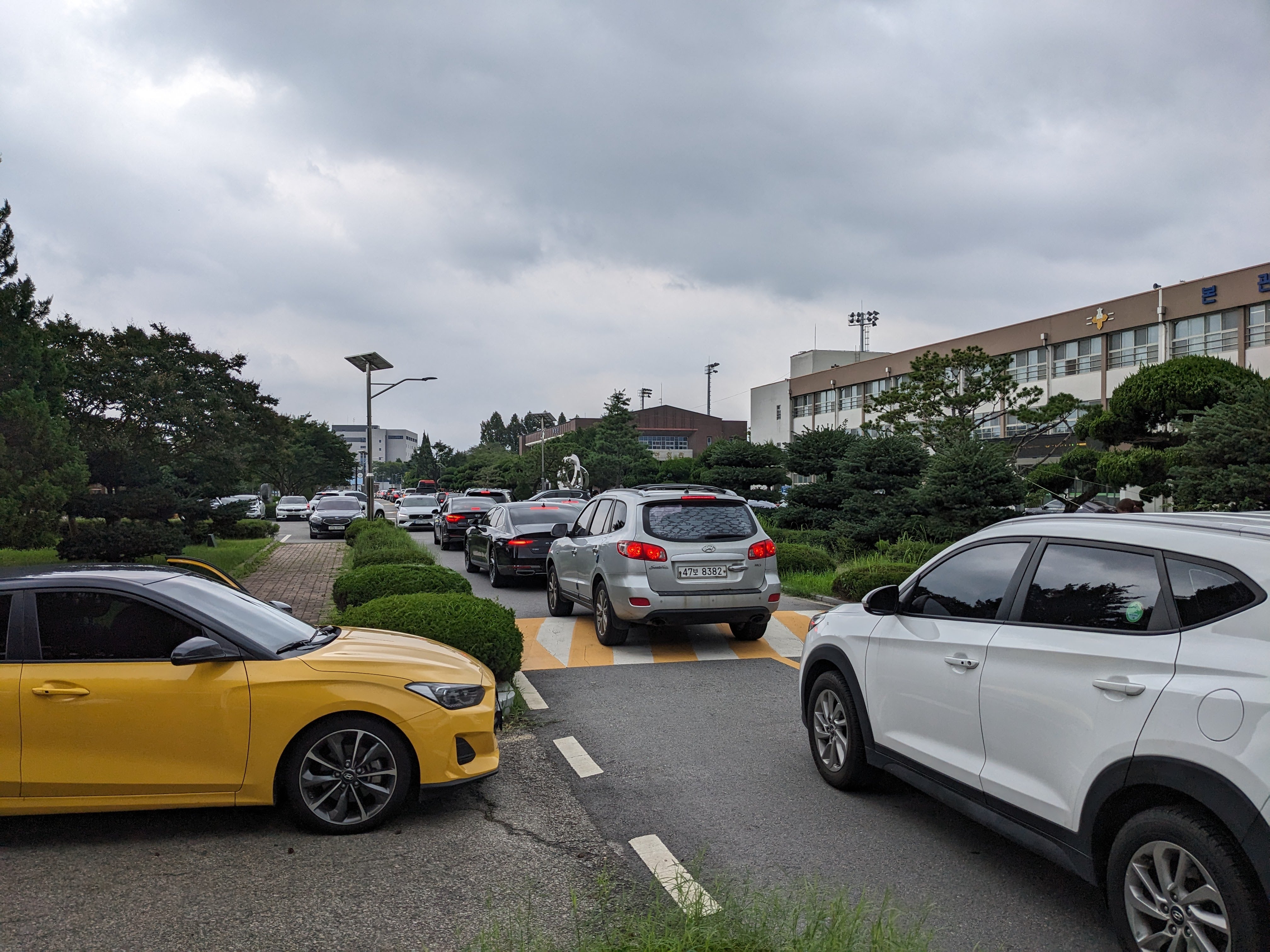 시험 끝나고 나갈때 교내 곳곳에 주차되있던 차량들이 학교에 하나 뿐인 차량 출입문으로 한꺼번에 몰리느라 병목현상이 생겼고, 교문 앞 직진 도로가 공사중이라 모든 차량이 좌회전을 해야했고, 하필 그 길은 불법주정차로 인해 왕복 4차선이 2차선이 되있었고, 큰 길로 빠져나오는 신호는 또 더럽게 길어 그야말로 교통체증의 모든 요소가 한 곳에 모여있었다. 본관에서 버스 정류장까지 10분 걸어가는 시간 아끼겠다고 차 끌고 왔다가 학교에 30분 갇혀있지 말고 얌전히 버스나 택시 타고 오자!