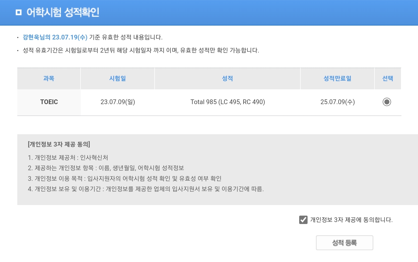 YBM 계정에 로그인하여 등록할 시험 결과를 선택하고 약관에 동의한 후 성적 등록 버튼을 누른다.