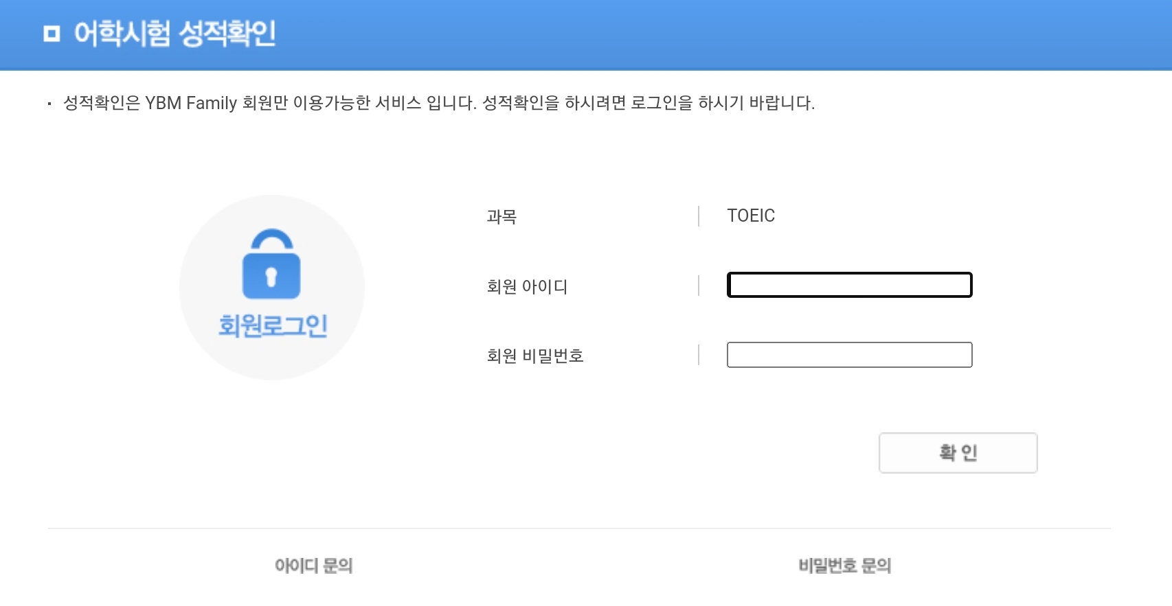 YBM 계정에 로그인하여 등록할 시험 결과를 선택하고 약관에 동의한 후 성적 등록 버튼을 누른다.