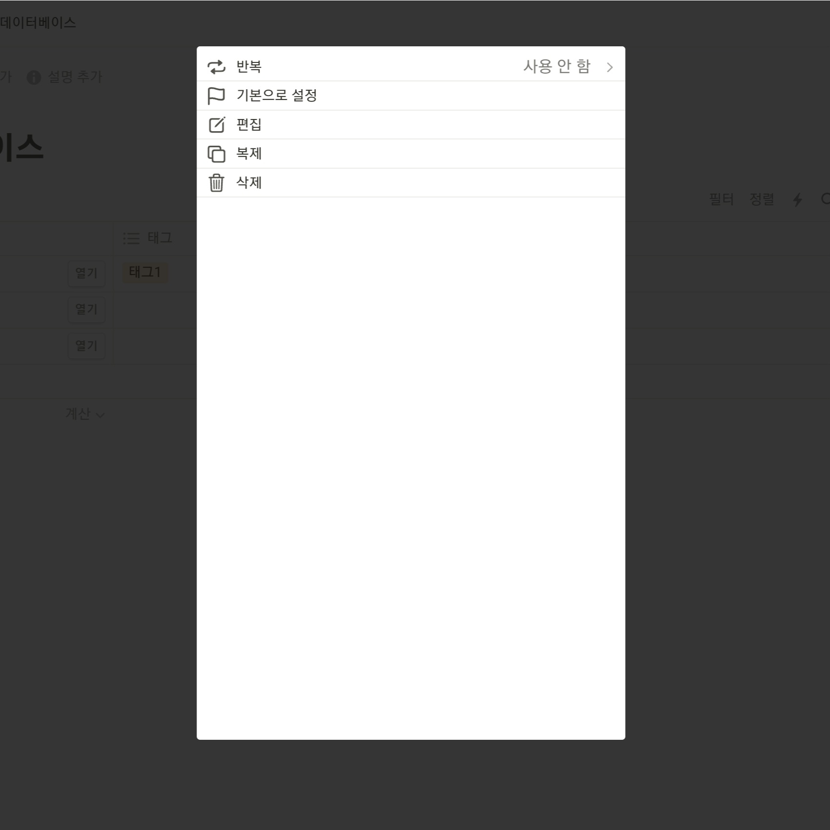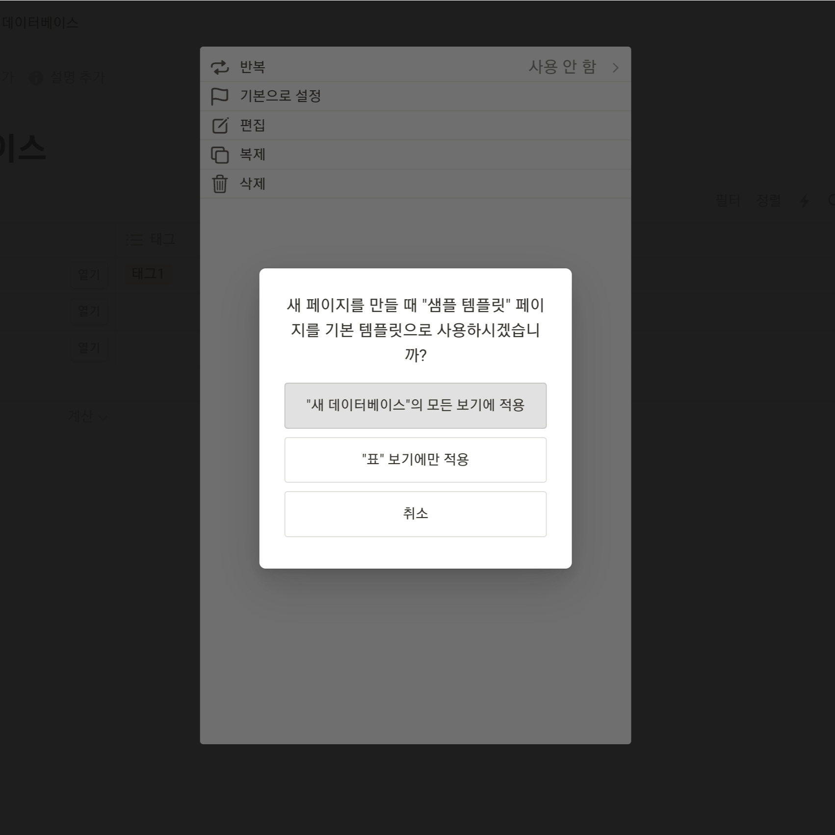 데이터베이스 템플릿 관리 화면에 들어가서 생성된 템플릿 옆 점 세개를 누르면 템플릿을 관리할 수 있다. 기본적인 편집, 복제, 삭제, 그리고 이 데이터베이스에서 새 페이지를 생성하면 해당 템플릿을 자동으로 불러오는 "기본으로 설정" 기능도 존재한다. 반복은 시간 단위로 반복하는 기능으로 보이는데... 어떻게 사용하는지는 잘 모르겠다.