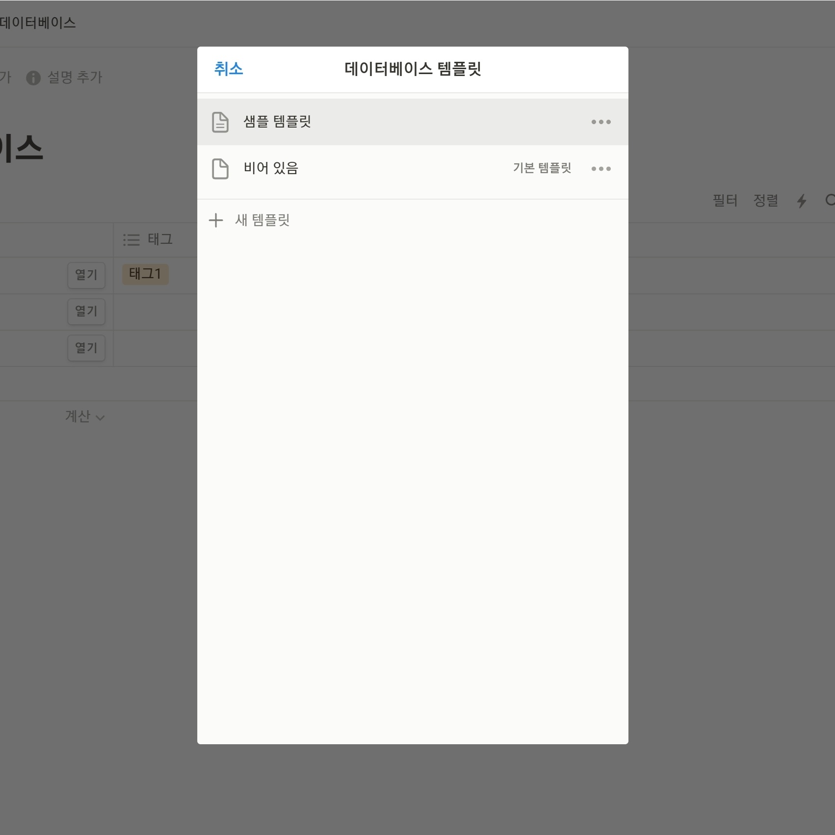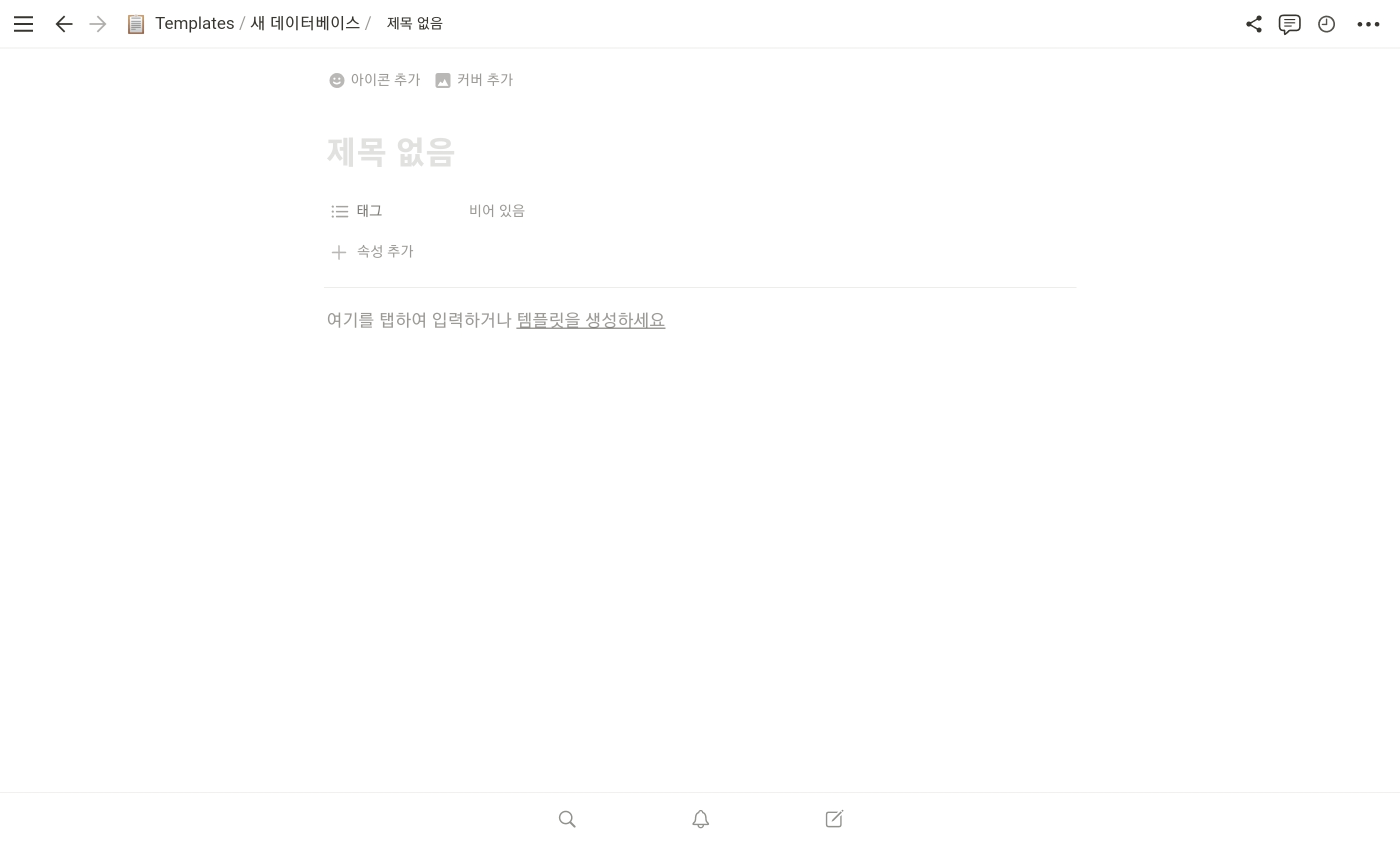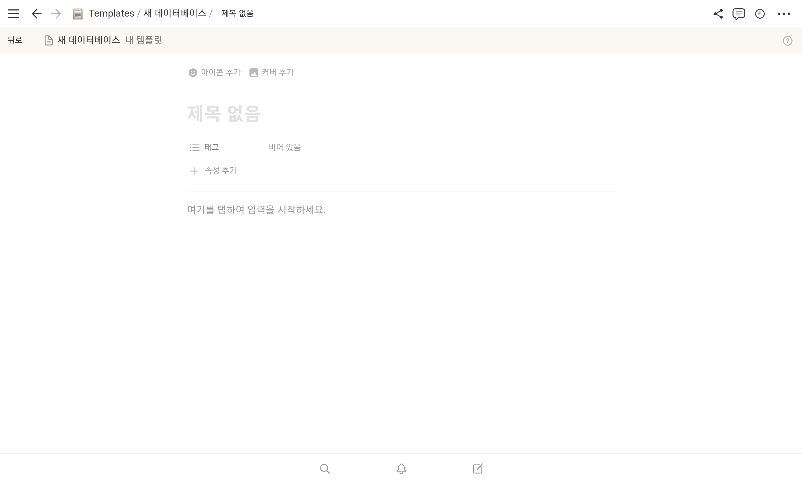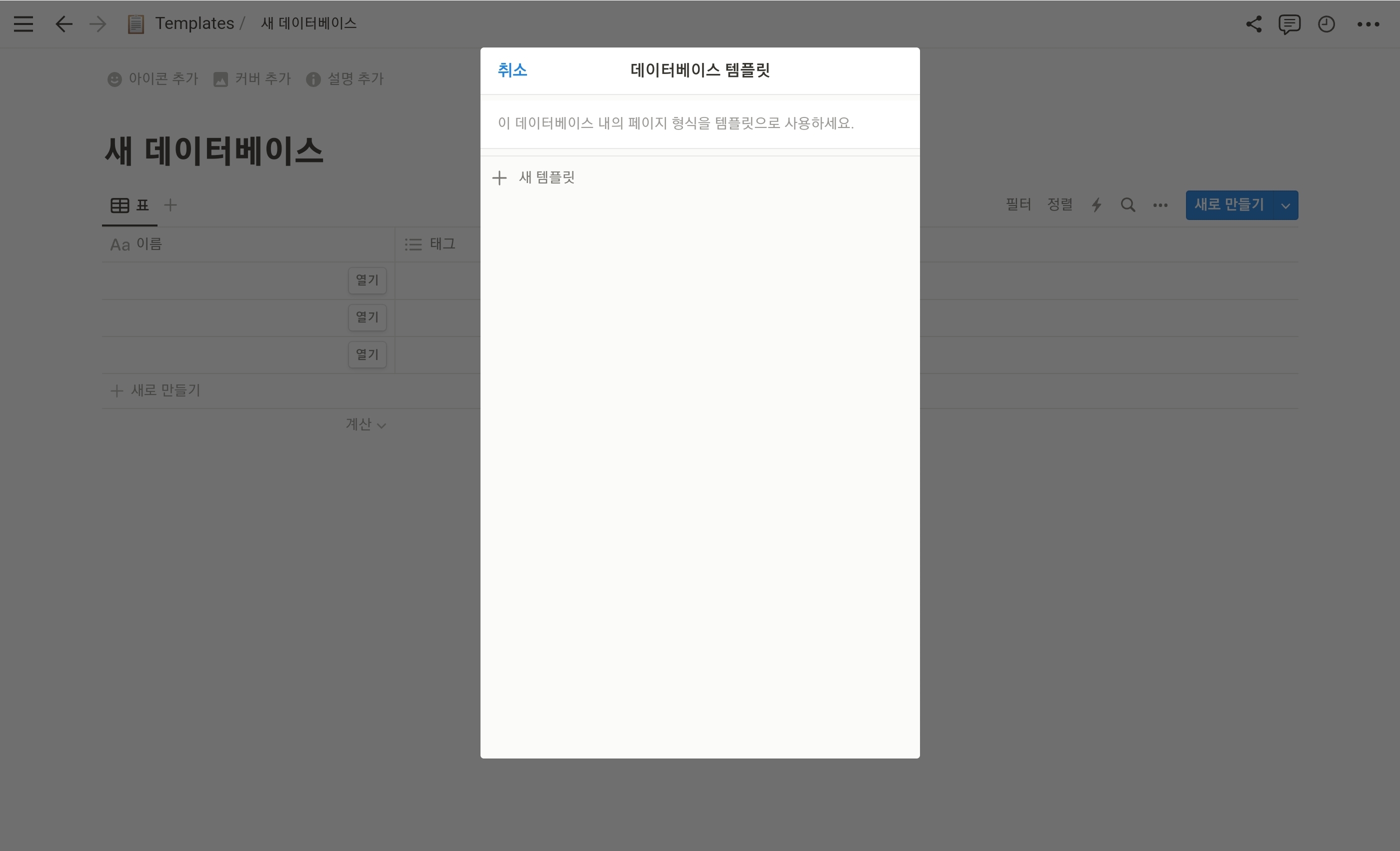데이터베이스 내에 새 페이지를 생성하면 "여기를 탭하여 입력하거나 템플릿을 생성하세요"라는 안내문구가 나온다. 혹은 데이터베이스의 "새로 만들기" 버튼 옆 우측 화살표를 누르면 데이터베이스 템플릿을 관리하는 메뉴가 나오는데, 여기서 "+ 새 템플릿" 메뉴를 누른다.