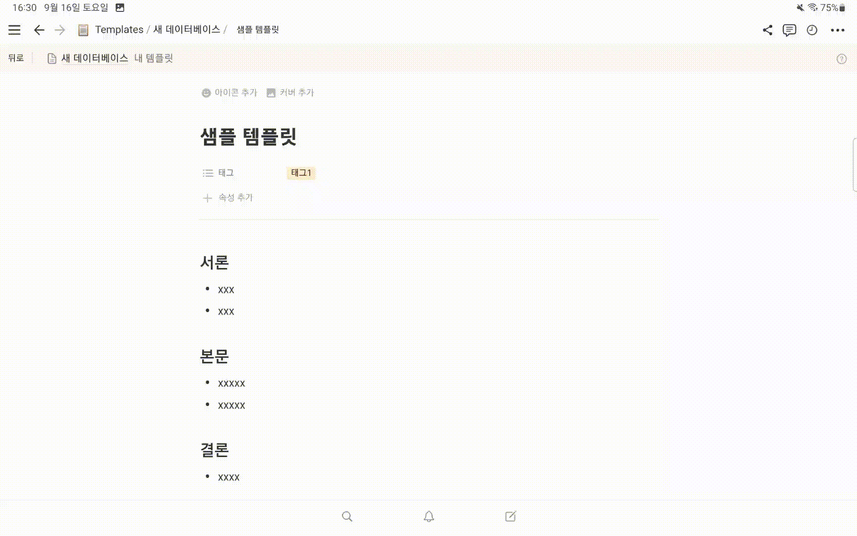 그러면 이렇게 템플릿 생성 페이지로 진입하게 된다. 겉보기엔 일반적인 새 페이지 화면과 똑같이 생겼는데, 즉 웬만한 일반 페이지에서 사용 가능한 기능들은 템플릿 생성 페이지에서 모두 지원한다. 리스트, 접기 양식, 사진 첨부같은 기본 기능들은 물론이고, 데이터베이스 생성, 서드파티 기능 임베드 모두 템플릿에서 사용이 가능하다.