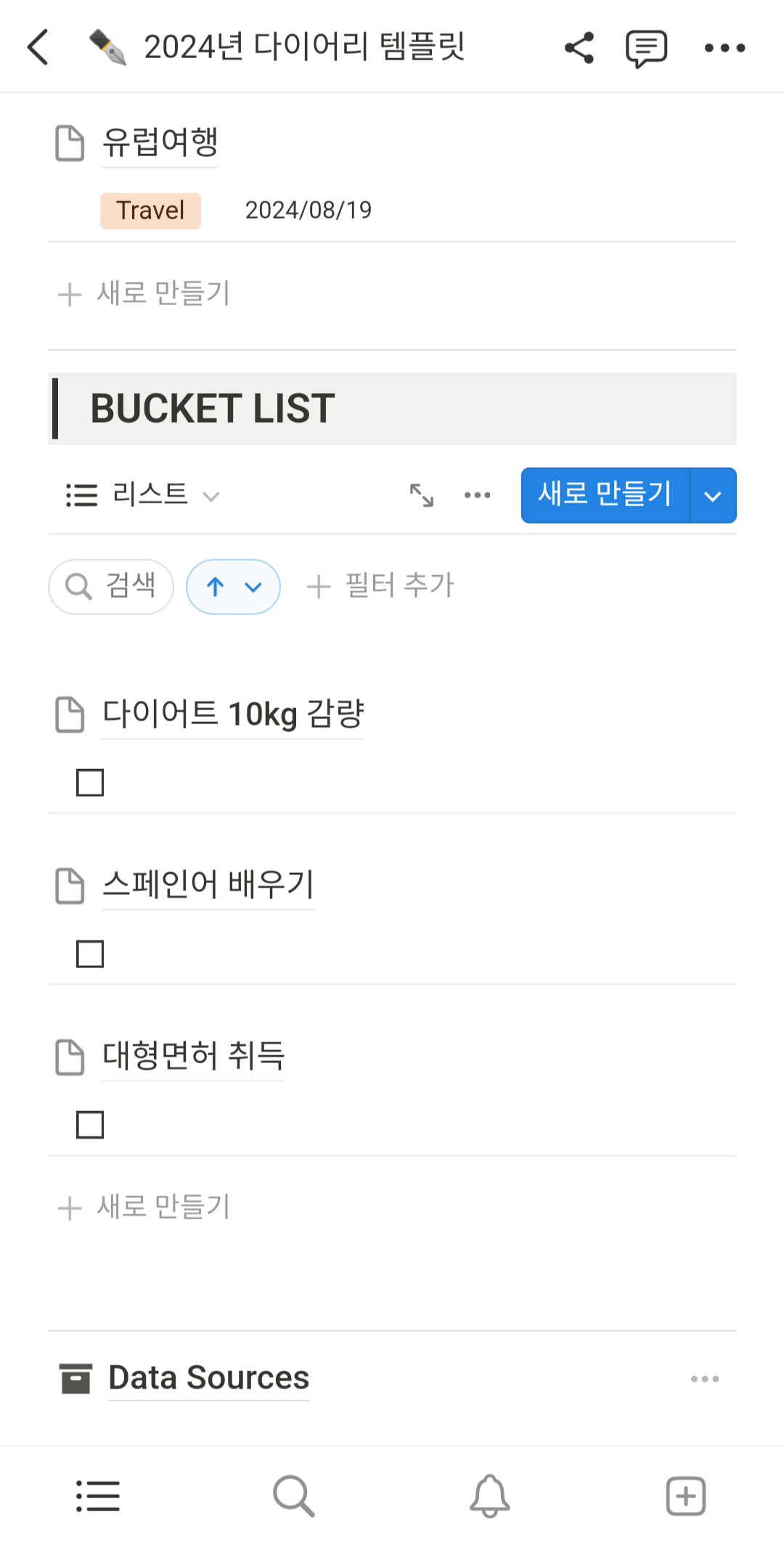 - 버킷 리스트: 새해에 달성하고 싶은 목표나 다짐을 기록하는 곳입니다. 플래너를 열때마다 확인하면서 올해에는 작심삼일 탈출을 향해 노력해보세요! (만약 "달성"의 기준이 애매하다면 체크리스트 속성을 삭제해서 사용하시면 됩니다.)