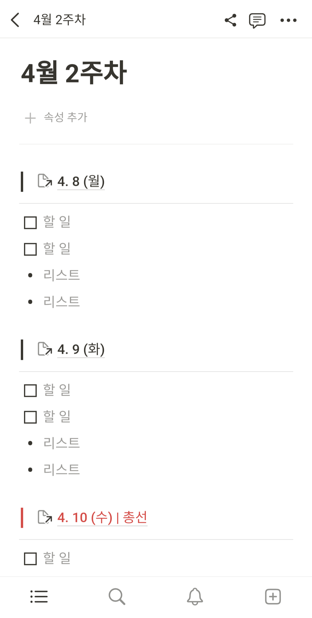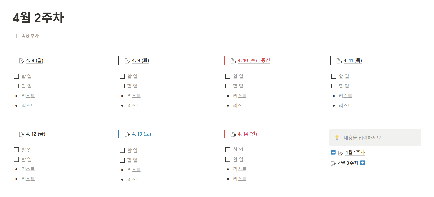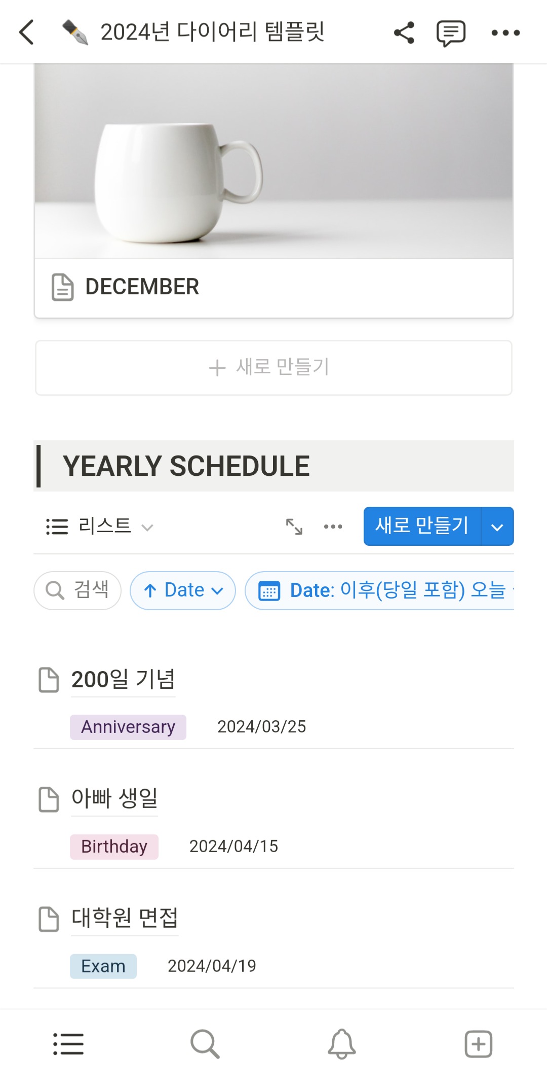 - 데일리 플래너에는 별도의 템플릿을 제공하지 않습니다. 자신의 습관에 맞게 자유롭게 매일 일기를 작성하시거나, 데이터베이스 템플릿을 통해 자신에게 맞는 일기 양식을 직접 제작하여 사용해보세요!