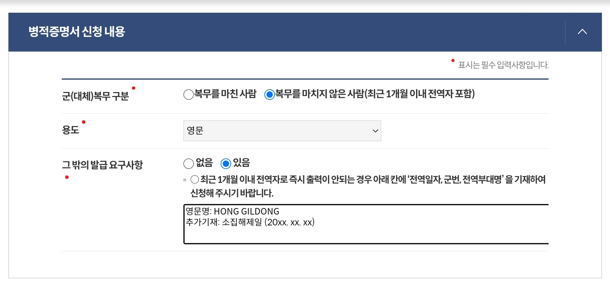 정부24로 영문 병적증명서 발급을 신청할때는 "그 밖의 발급 요구사항"란에 본인의 영문명을 기재해야한다. 여기에 위 사진처럼 추가로 소집해제일 기재를 요청한다.