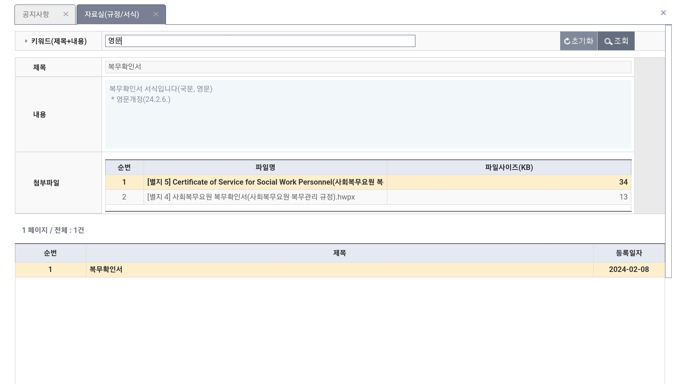 사회복무포털에 로그인하여 좌측 자료실(규정/서식) 메뉴에 들어가서 "영문"이라고 검색하면 국문 및 영문 복무확인서 서식을 다운받을 수 있다. 이로써 "사회복무요원 영문 복무확인서"라는건 존재한다는걸 알 수 있다. 참 꽁꽁 숨겨놨다.