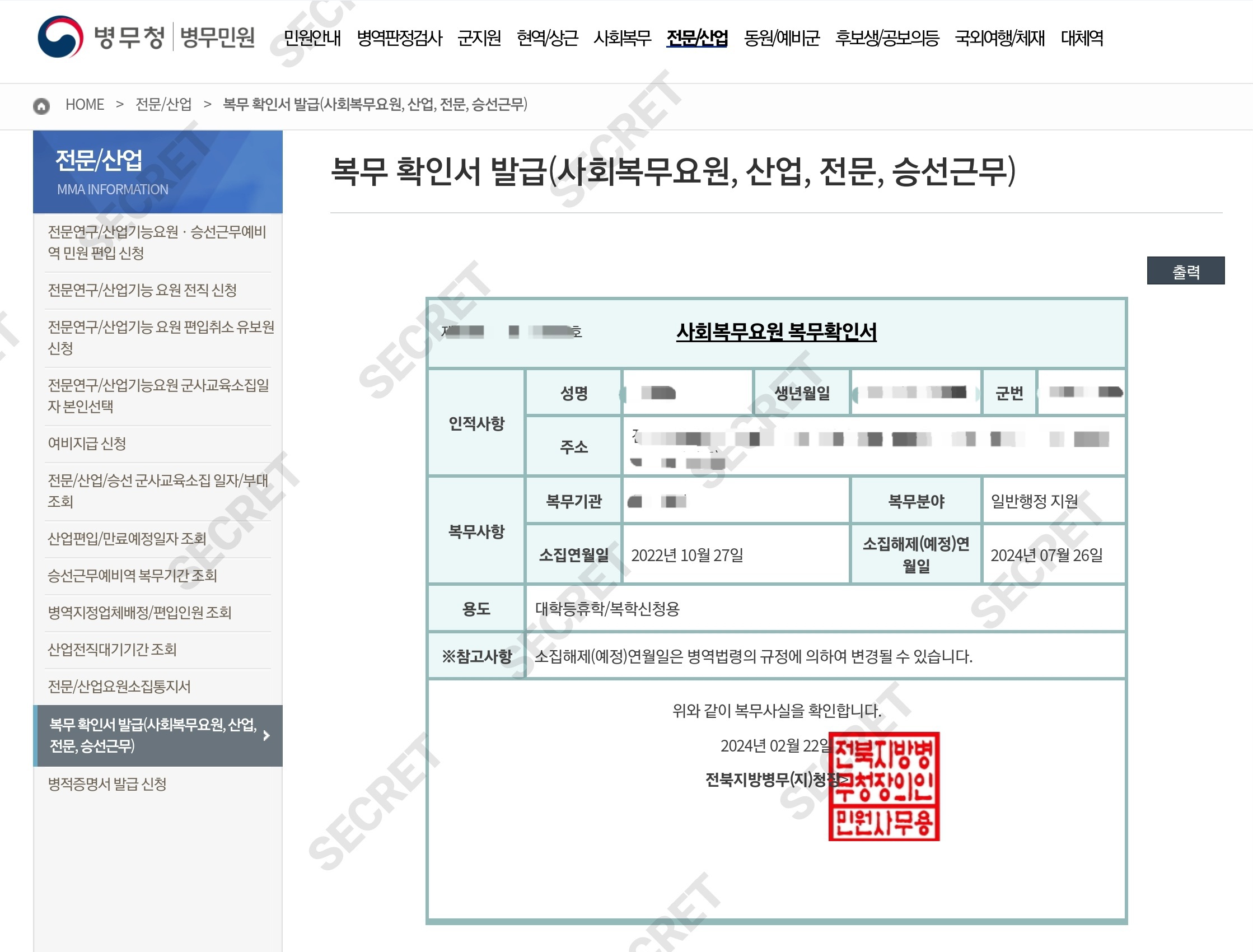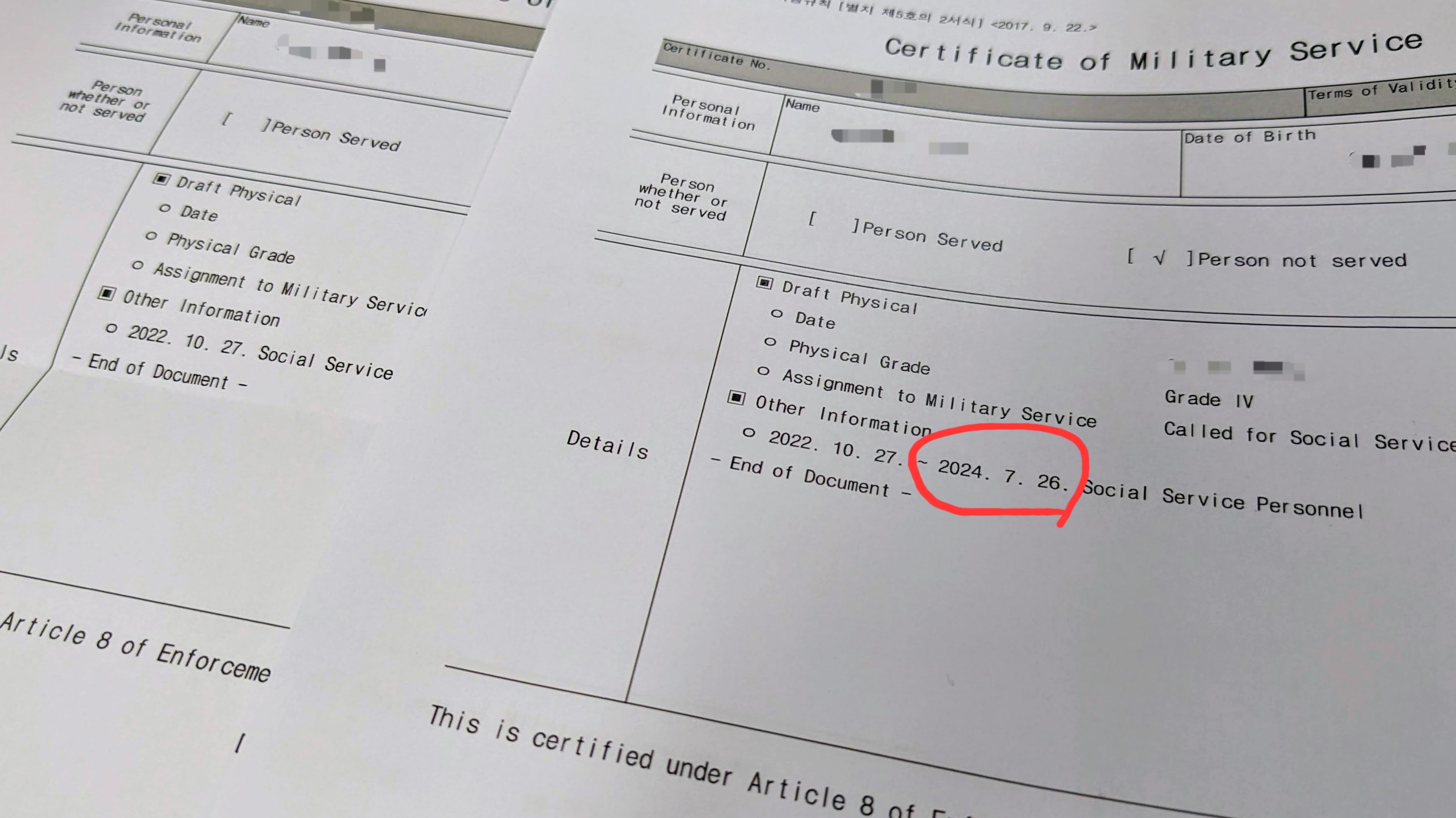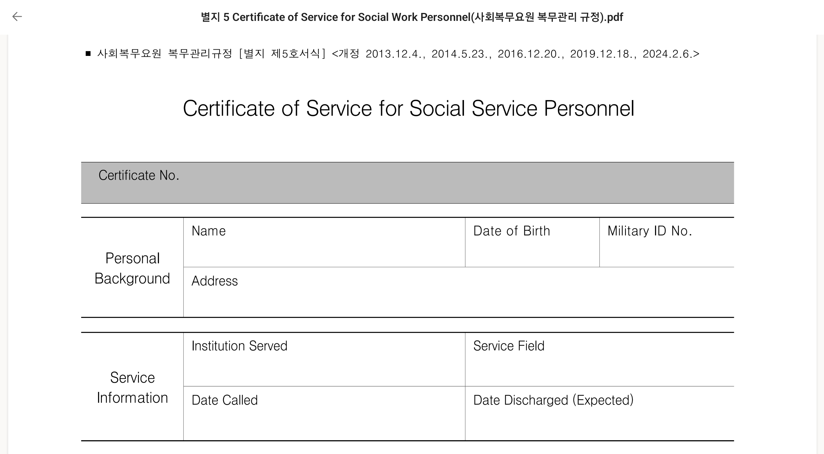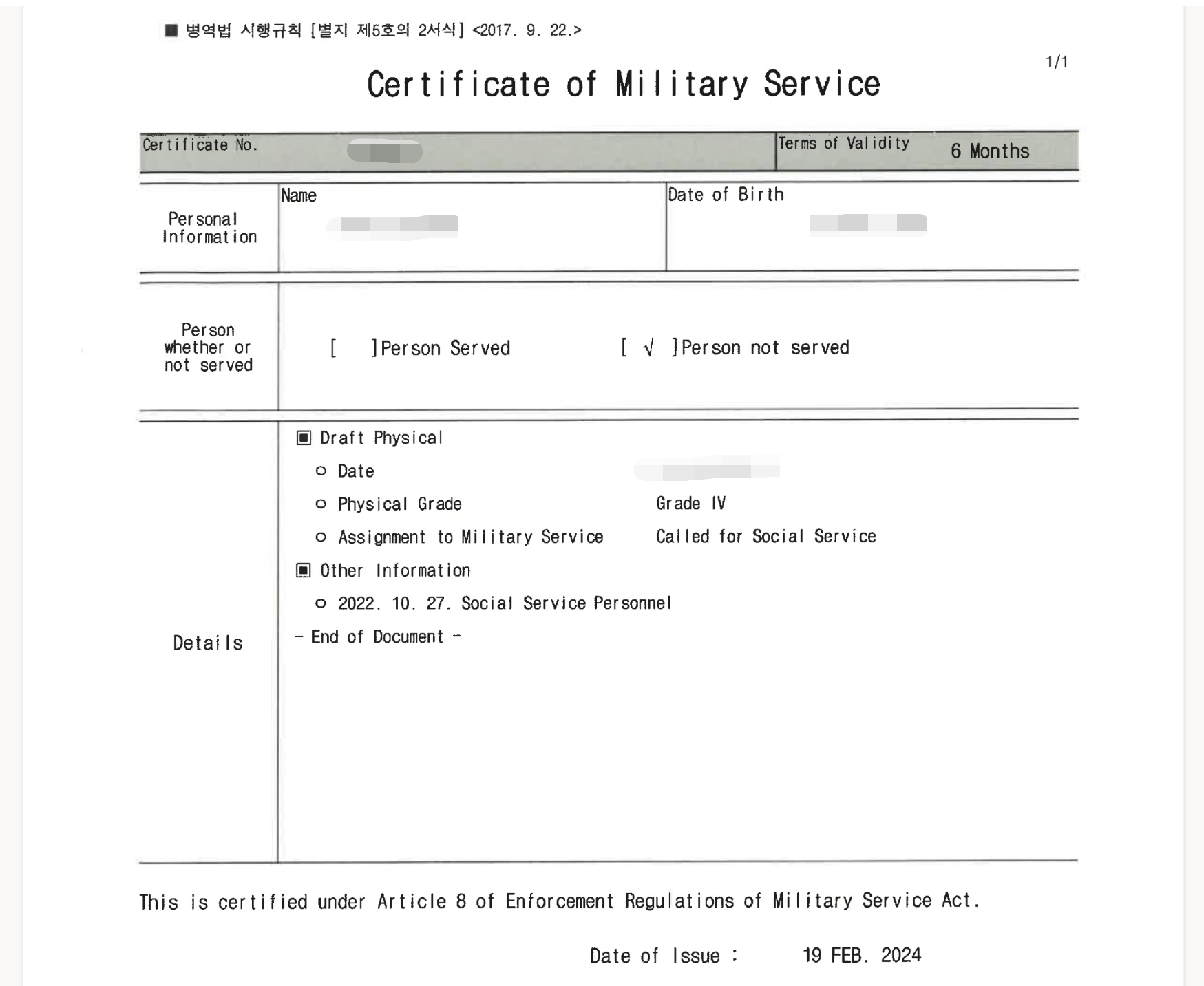 하지만 문제가 있었다. 병무민원 사이트에서 발급 가능한 사회복무요원 복무확인서는 영문판이 없고, 정부24에서 발급 가능한 병적증명서는 영문 발급이 가능했으나 아직 복무를 마치지 않은자는 전역/소집해제일이 기재되지 않는다.
