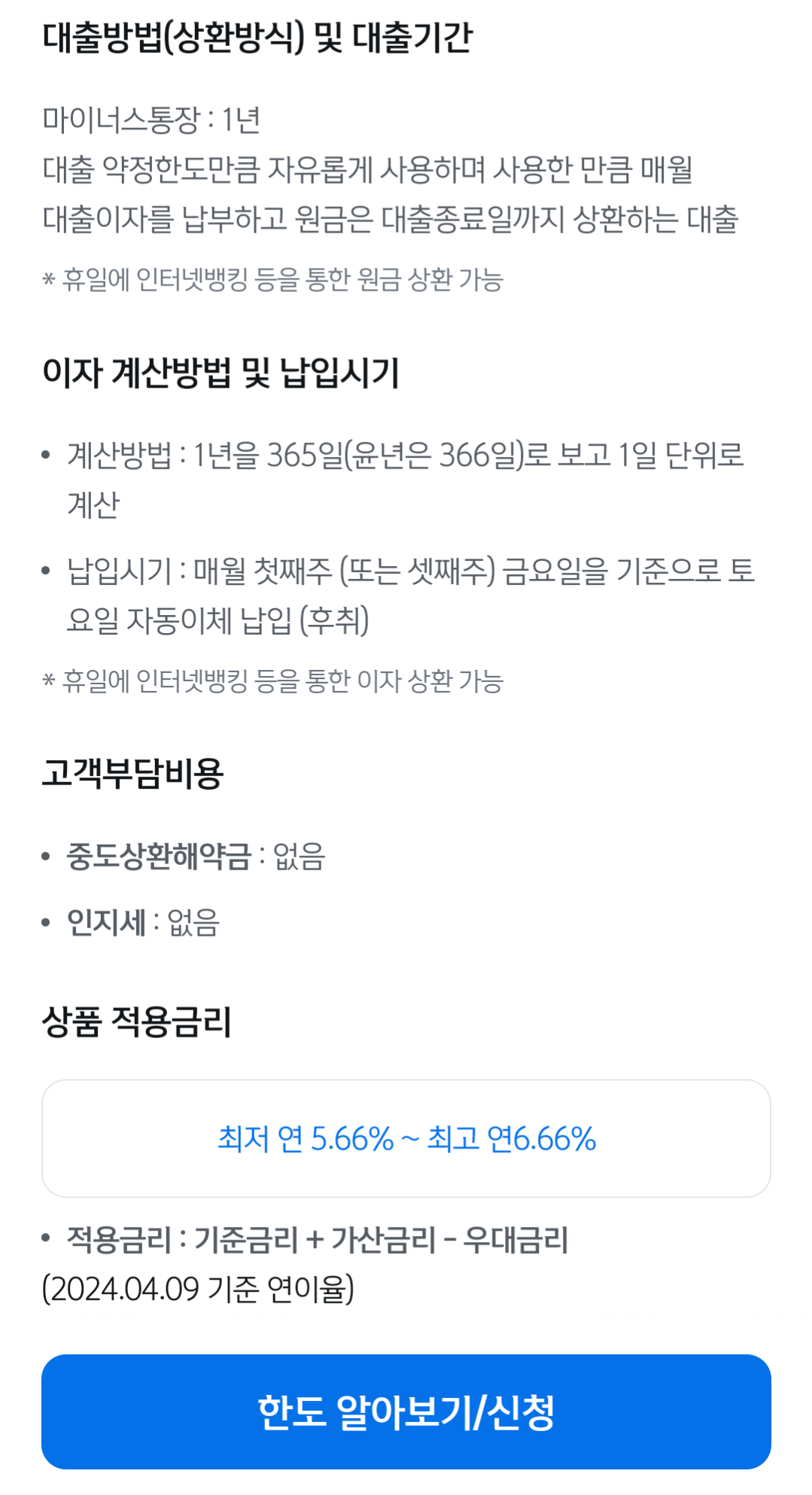 중도상환해약금이 "없음"인지 확인한 다음 (안그러면 해약금 내야할수도 있음), 한도 알아보기/신청을 눌러 대출 신청을 시작한다.
